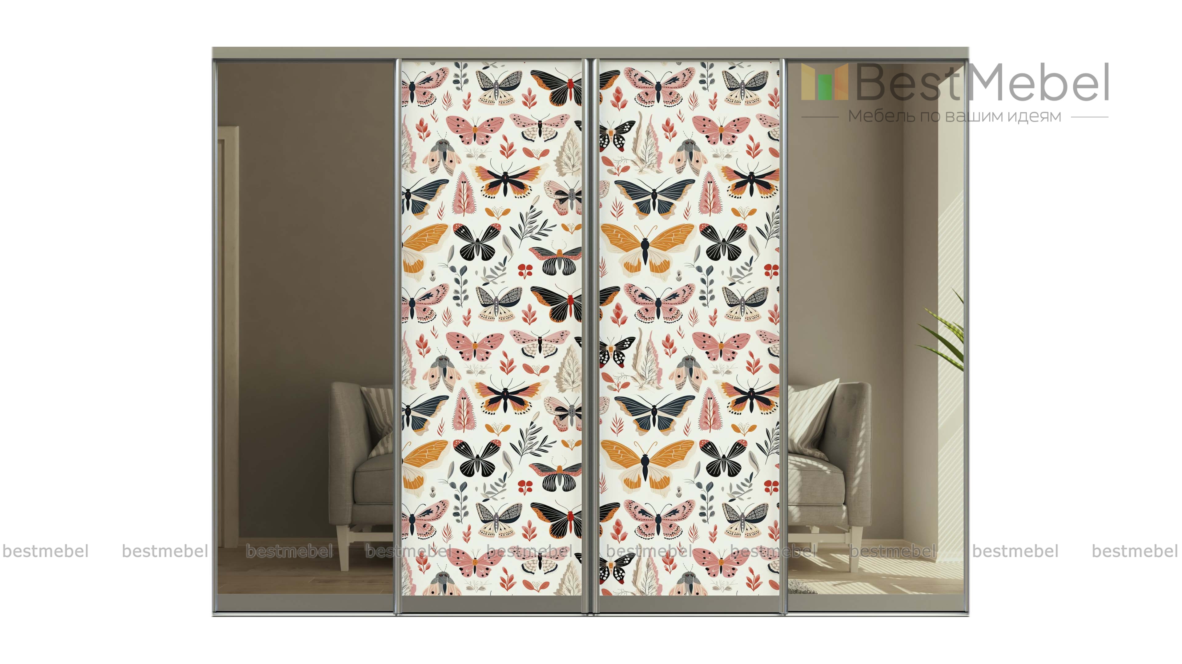 Двери-купе Лайма 1 BMS не только сэкономят, но и визуально расширят пространство. Композиция для современного спального интерьера, входной зоны или детской включает в себя две створки с фотопечатью и два полностью зеркальных полотна в алюминиевом профиле. Трендовый принт «бабочки» наполнит атмосферу комнаты уютом и создаст стильный интерьерный акцент. Купить двери-купе Лайма 1 BMS, изготовленные по вашим размерам, можно на сайте нашего интернет-магазина.