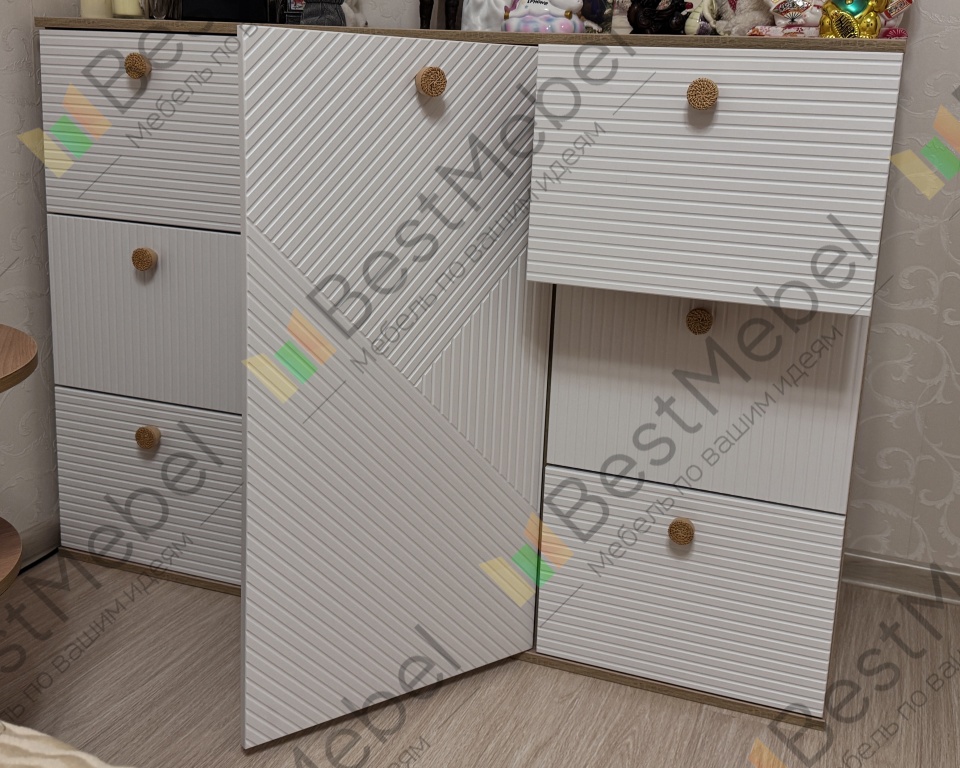Номер заказа 1129867.Больше года искала себе комод с адекватным соотношением цена/качество. И, наверное, ещё бы долго искала, если бы подруга не посоветовала мне BestMebelShop, в котором они покупали большое количество мебели в новую квартиру.Что я могу сказать? Мои ожидания оправдались на все 100, очень довольна качеством комода, но больше всего понравилась возможность сделать заказ под индивидуальные размеры, а также самой выбрать цвет корпуса и фасадов.От сборки отказалась, сами собирали, это оказалось совсем даже не сложно, вдвоем справились! В комплекте к комоду были ножки, но их не стали устанавливать, потому что кот будет все свои игрушки под него таскать, а нам потом ползать и доставать. Комод очень аккуратный, красивый, потрясающе вписался в цветовое решение комнаты. Единственное, что запах не ушел пока, который чувствуется при открытии ящиков, но это у любой новой мебели такое.