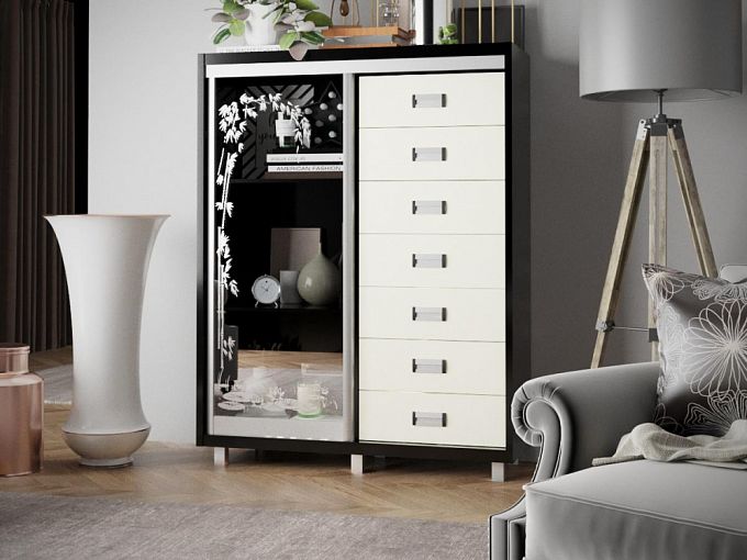 Комод Готика BMS объединен с витриной, в которой будут выставлены изысканная посуда, любимые книги и прочие ценные вещи. Семь выдвижных ящиков, оснащенных не выступающими над поверхностью фасада врезными ручками, незаменимы для хранения одежды, аксессуаров и всевозможных мелочей. Выполненный в строгой контрастной гамме, комод оборудован высокими ножками и украшен изящным растительным мотивом. Купить комод Готика BMS вы сможете в нашем интернет-магазине, по желанию изменив цвет и размеры.