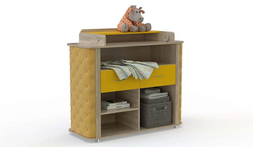Пеленальный комод Альт 7 BMS украсит детскую и обеспечит комфортный уход за малышом. Продуманная система хранения включает в себя два выдвижных ящика и четыре открытых секции разных размеров, а откидной столик с защитными бортиками увеличивает пеленальную поверхность. Отсутствие острых углов поможет избежать случайных травм, закругленные боковины декорированы мягкой текстильной обивкой желтого цвета с каретной стяжкой. Купить пеленальный комод Альт 7 BMS приглашаем в наш интернет-магазин с выбором оптимального варианта обивки.