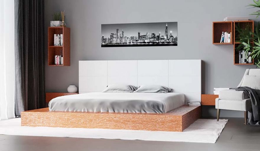 Кровать Азалия 3 BMS выполнена в стиле минимализм и отличается функциональным современным дизайном. Модель оборудована глухим подиумным основанием и просторным спальным местом, а высокая спинка в изголовье дополнена навесными прикроватными тумбами и полками для книг и мелочей. В оформлении эффектно сочетаются теплые древесные тона и белый с геометричной фрезеровкой. Купить кровать Азалия 3 BMS вы сможете на сайте нашего интернет-магазина по выгодной цене.