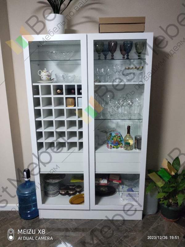 Данный шкаф - третья покупка в этом магазине. Заказан по индивидуальным параметрам: высота - 2000; ширина - 600; глубина - 400 (можете соотнести с фото, чтобы понимать по габаритам). Цвет корпуса - белый (структура дерева); цвет фасада - белый гладкий.Пройдусь по достоинствам и недостаткам.Достоинства:1. Большой выбор моделей шкафов, особенно с вставкой для бутылок. Нужен был именно такой элемент. 2. Индивидуальные параметры. Кроме индивидуального размера, можно заметить, что в правой части шкафа полки несимметричны относительно левой части. Я специально попросил сделать именно так (убрать одну полку и оставшиеся расположить равномерно), чтобы было больше места. Всё сделали без проблем. 3. Цвет подходит под кухню. Белый гладкий более яркий, более "белый" (уж простите за тавтологию). Белый структура дерева не такой насыщенно белый, разница видна. Постарался передать на фото. 4. Быстрое изготовление, быстрая доставка.5. Оплата наличными при получении. Для меня это один из главных плюсов. Не переживаешь за свои деньги. Видишь товар в целости - платишь. Недостатки:1. Когда привезли товар, оказалось, что один элемент шкафа (боковина) сильно повреждена. Я не стал возвращаться весь шкаф, связался с магазином, попросил заменить данный элемент. Через 5 дней мне привезли новую целую боковину, бесплатно. В этом плане магазин клиентоориентирован (что плюс!), но по факту получения видеть брак не очень приятно. Хочется же сразу и собрать, а тут ещё ждать. 2. Трудная сборка. Не раз собирал шкафы, но здесь не справился, вызвал мастера, он собирал 2,5 часа. Нет понятной инструкции. Да её никогда и нигде нет, это ясно, но здесь особенно запутанно.В общем, товаром на данный момент доволен. Подсветку не покупал. Думаю поставить сам. Надеюсь, отзыв кому-то окажется полезен.