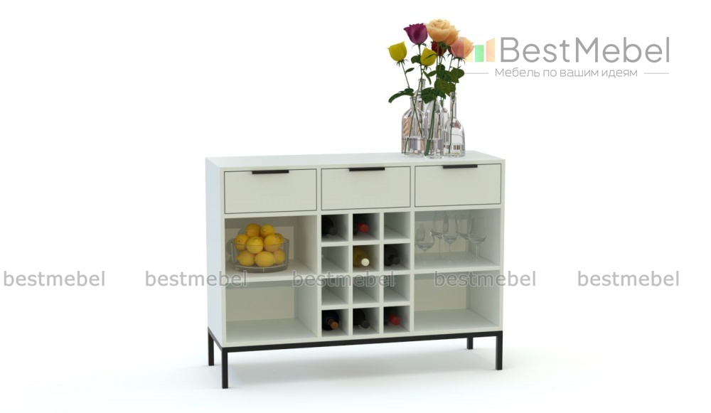 Стеллаж Бонни 12 BMS может выполнять функцию мини-бара в интерьерах стиля лофт, минимализм или индастриал. Широкая модель оборудована тремя выдвижными ящиками для мелочей, открытыми отделениями под бокалы и аксессуары и расположенными в центре ячейками для горизонтального хранения бутылок с винами. Выполненный из ЛДСП корпус универсального белого цвета располагается на прочном основании из металлического профиля. Купить стеллаж Бонни 12 BMS приглашаем в наш интернет-магазин с выбором цвета по каталогу.