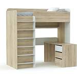 Детская кровать-чердак Дм110 BMS – практичная модель для небольшой по площади комнаты ребенка. Здесь удачно реализована учебная зона и спальное место. Оно находится наверху, в целях безопасности оборудовано бортами. Лестница устойчивая, прочно крепится к каркасу. Под основанием расположен стол. Он оснащен отделениями для хранения (выдвижные ящики). Габариты столешницы подойдут младшему школьнику. Учебники и книги расставьте на полке. Привлекательная конструкция сделана из ЛДСП. Цвет материала подбирается под стиль интерьера и вкусы владельца.