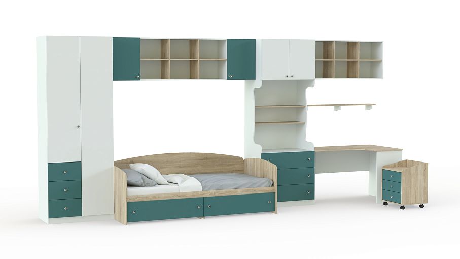 Детская мебель Белоснежка 7 BMS – современный модульный комплект, визуально легкий и практичный. Отдельные элементы вы сможете вписать в помещения любой планировки, а свежие краски создадут комфортную для отдыха и учебы атмосферу. В комплект входят кровать-софа с ящиками, двухстворчатый платяной шкаф, антресоль, навесные полки, комбинированный книжный шкаф, угловой компьютерный столик и тумба на колесиках. Все углы безопасно закруглены. Купить детскую мебель Белоснежка 7 BMS вы сможете в нашем интернет-магазине с подбором оптимальных параметров.