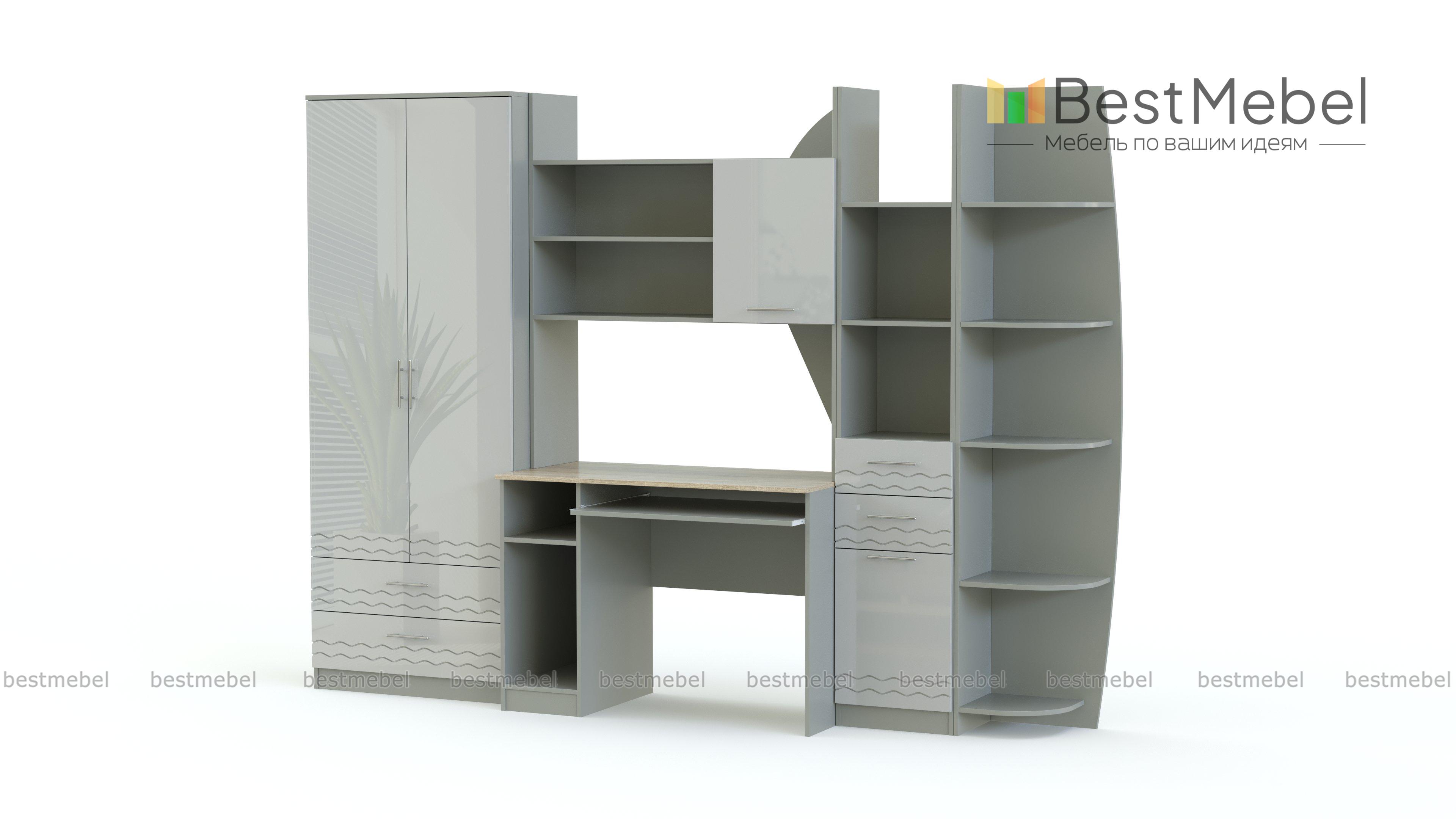 Светлая легкая детская стенка Белла-2 BMS своей необычной формой и рисунком на фасадах вызывает в памяти путешествия и приключения. Такая модель точно придется по душе юным фантазерам и создаст в комнате особую атмосферу. Для комфортной учебы и аккуратного размещения книг, игр и предметов гардероба стенка оборудована компьютерным столом, комбинированным шкафом, навесной полкой, стеллажом и угловой секцией со скругленными открытыми полками. Ящики оснащены практичными пластиковыми ручками-рейлингами.