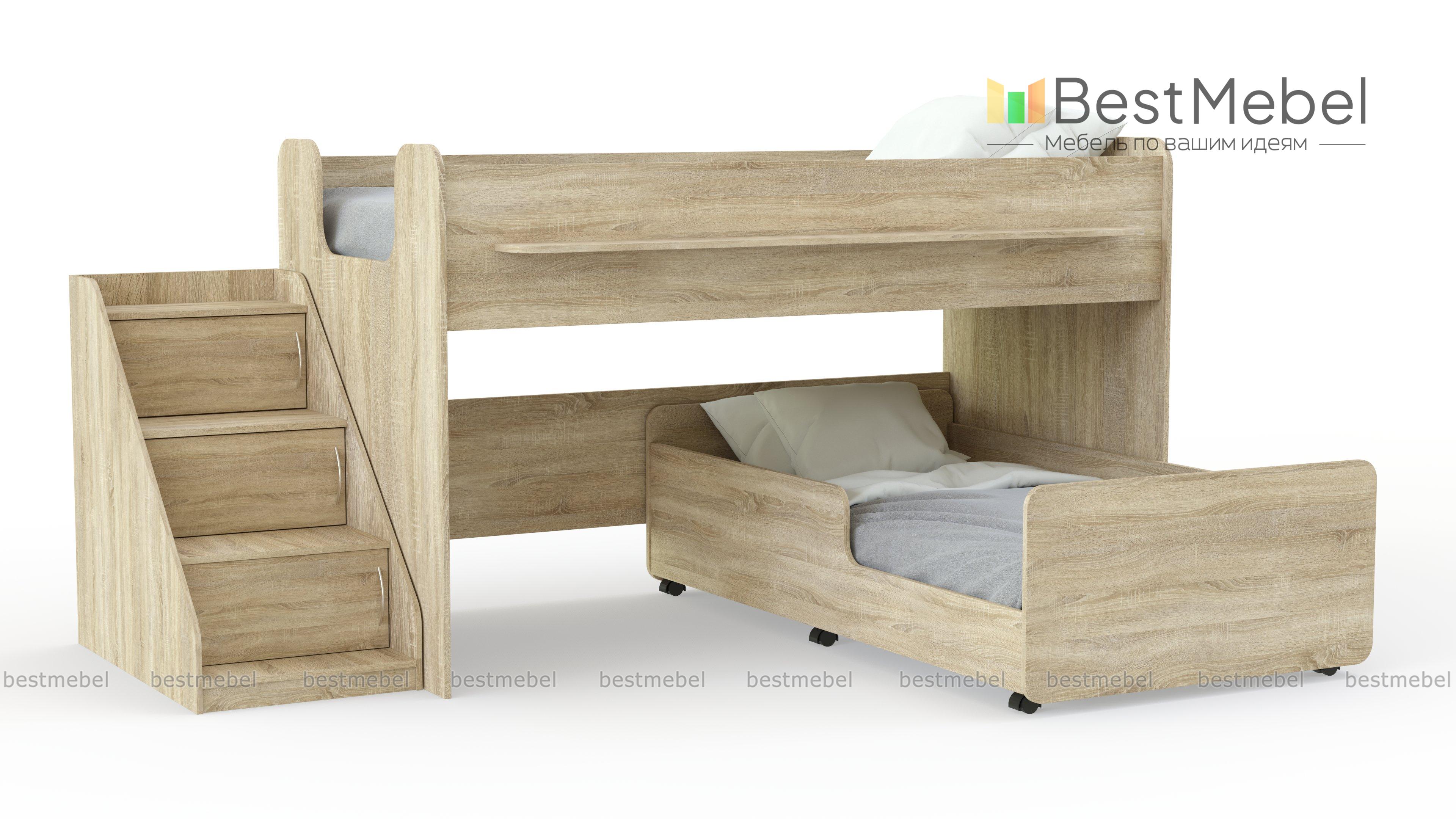 Кровать-чердак Миф 23.4 BMS поможет обустроить уютную спальню для двоих детей. Спальное место второго яруса оборудовано защитным бортиком, а в нише на первом скрывается дополнительная выкатная кровать. Легко забраться в постель и компактно разместить игрушки поможет ребенку приставная лестница-комод с просторными ящиками под ступеньками. Купить кровать-чердак Миф 23.4 BMS, выполненную в нейтральном белом цвете, приглашаем недорого в наш интернет-магазин.