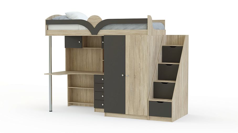 Кровать-чердак с рабочей зоной Мираж К-32 BMS предназначена для меблировки малогабаритных квартир и включает в себя все необходимое ребенку для полноценного отдыха, учебы и хранения вещей. Многофункциональный комплект состоит из кровати с защитным скругленным бортиком, лестницы-комода, распашного платяного шкафа и рабочей зоны со столом, тумбой и надстройкой с полками. Корпус светлых древесных тонов сочетается с контрастными фасадами. Купить кровать-чердак с рабочей зоной Мираж К-32 BMS вы сможете в нашем интернет-магазине, подобрав цветовое решение.