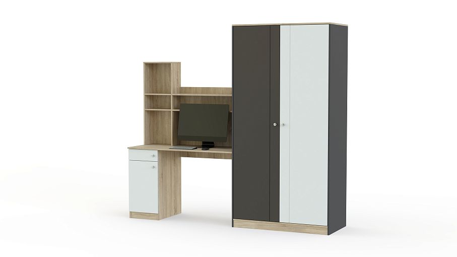 Детская стенка Сплинни 1 BMS объединила вместительный платяной шкаф с компьютерным столом, оборудованным тумбой и надстройкой. Модель позволяет грамотно спланировать пространство детской и освободить место для игр. В оформлении разноуровневой стенки использованы спокойные нейтральные оттенки, контрастные вставки и неброская вертикальная фрезеровка. Купить детскую стенку Сплинни 1 BMS приглашаем в наш интернет-магазин с возможностью выбора цвета и размеров.