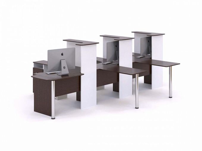 Бенч-система Лора 51 BMS гармонично сочетает оригинальный современный дизайн с высокой функциональностью. Практичная конструкция обеспечит всем необходимым для полноценной работы четырех сотрудников и незаменима для приема посетителей. Система объединила угловые компьютерные столы с тумбами и разделительными перегородками и приставные скругленные элементы на хромированных опорах. Солидный вид просторному опен спейсу придаст исполнение в насыщенных древесных тонах. Купить бенч-систему Лора 51 BMS вы сможете выгодно в нашем интернет-магазине.