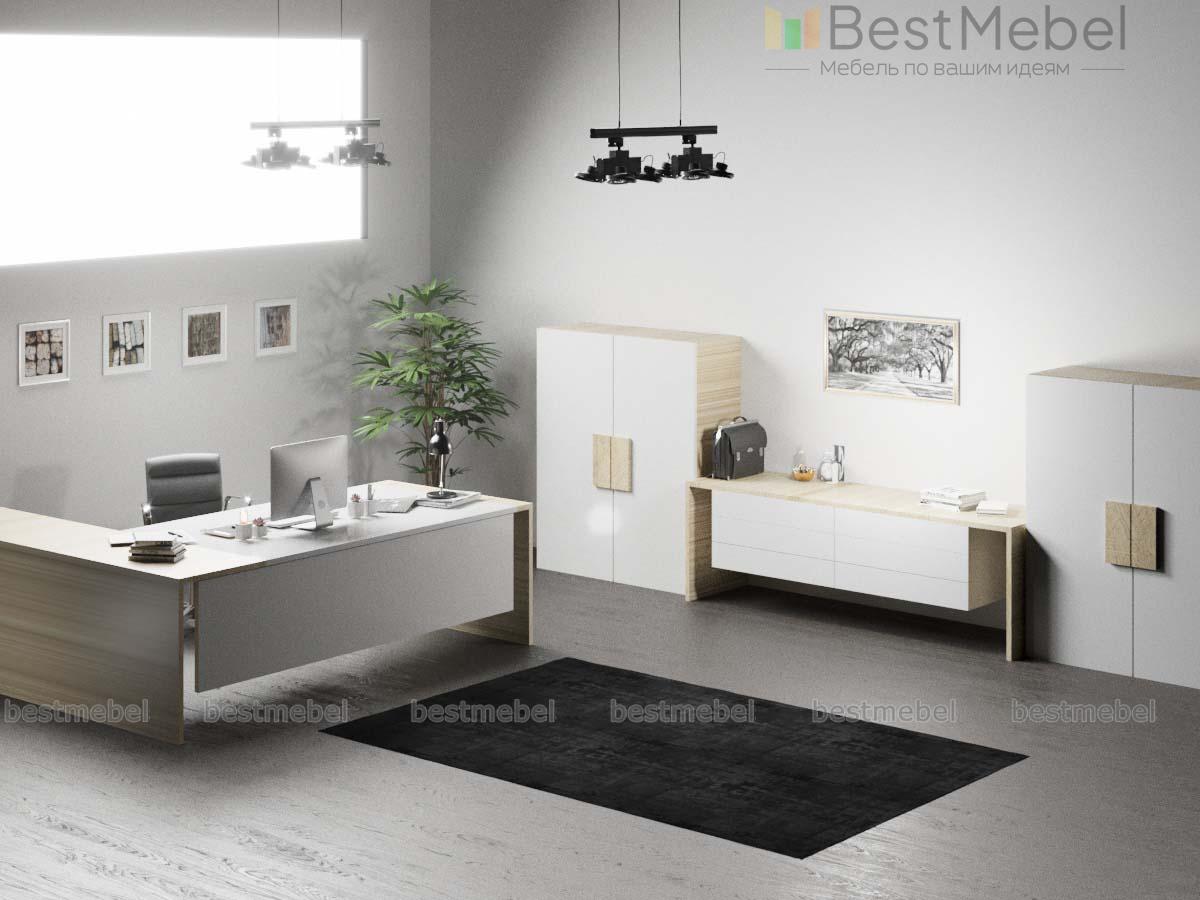 Кабинет руководителя Лира 4 BMS гармонично впишется в современные минималистичные интерьеры. Эффектная модульная композиция включает в себя угловой письменный стол с просторной рабочей поверхностью, тумбу с выдвижными ящиками и консолью и два распашных шкафа с полками для документов. Строгую геометрию линий предметов подчеркивает цветовое решение – теплые древесные тона и белоснежный глянец. Купить кабинет руководителя Лира 4 BMS вы сможете в нашем интернет-магазине по лучшей цене.