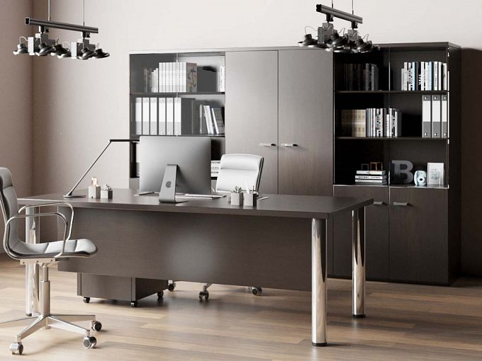 Кабинет руководителя Вакса 7 BMS сочетает современный дизайн и качество исполнения с доступной ценой. Модульный комплект состоит из рабочего стола с классической прямоугольной столешницей, двух комбинированных шкафов для документов со стеклянными дверцами и гардеробного шкафа. В оформлении предметов эффектно сочетаются поверхности темных древесных тонов и хромированные элементы. Купить кабинет руководителя Вакса 7 BMS и оборудовать комфортное рабочее место вам всегда поможет наш интернет-магазин.