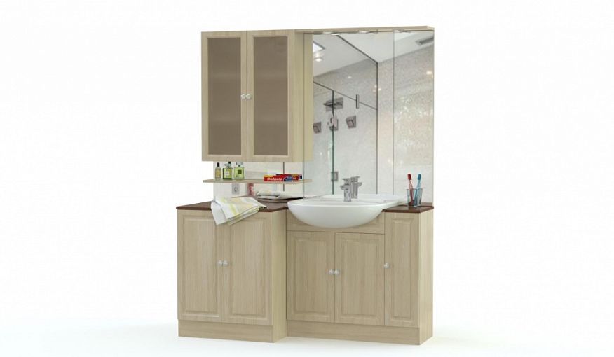 Комплект для ванной комнаты Ассоль 3 BMS предназначен для меблировки просторных помещений и отличается классическим дизайном. Напольная тумба под раковину дополнена тумбами с распашными отделениями, большим зеркалом с подсветкой и навесным шкафом со стеклянными дверцами. Фрезерованные рамочные фасады в бежевом цвете делают комнату визуально светлее и выполнены из влагостойких, долговечных материалов. Купить комплект для ванной комнаты Ассоль 3 BMS вы сможете в нашем интернет-магазине.