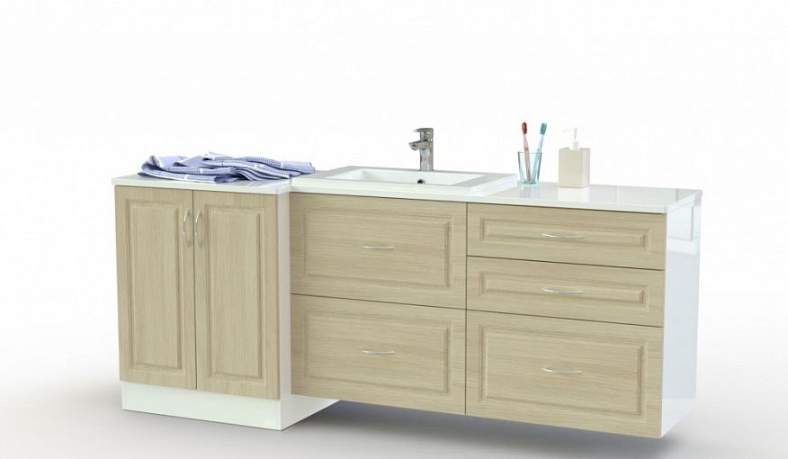 Тумба под раковину Франко 2 BMS станет частью роскошного интерьера в неоклассическом стиле. Широкая модель, объединившая напольную распашную секцию и навесную с выдвижными ящиками, компактно разместит большое количество вещей – уходовые средства, аксессуары, текстиль и бытовую химию. Просторная столешница под врезную раковину, выполненная в светлых тонах, эффектно сочетается с фрезерованным фасадом. Купить тумбу под раковину Франко 2 BMS приглашаем в наш интернет-магазин.
