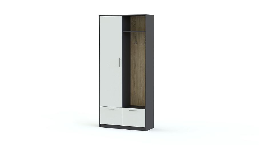Стенка-прихожая «Идеал 1» BMS – идеальное решение для малогабаритного современного помещения. Миниатюрная стенка без труда впишется в интерьер благодаря прямой конструкции и возможности выбора цветовой гаммы. В комплекте бельевой шкаф, тумба, панель с двумя крючками для одежды и полка для головных уборов. Корпус темного оттенка сочетается со светлыми фасадами и оригинальной контрастной древесной панелью. Купить стенку-прихожую «Идеал 1» BMS по доступной цене вы сможете в нашем интернет-магазине.