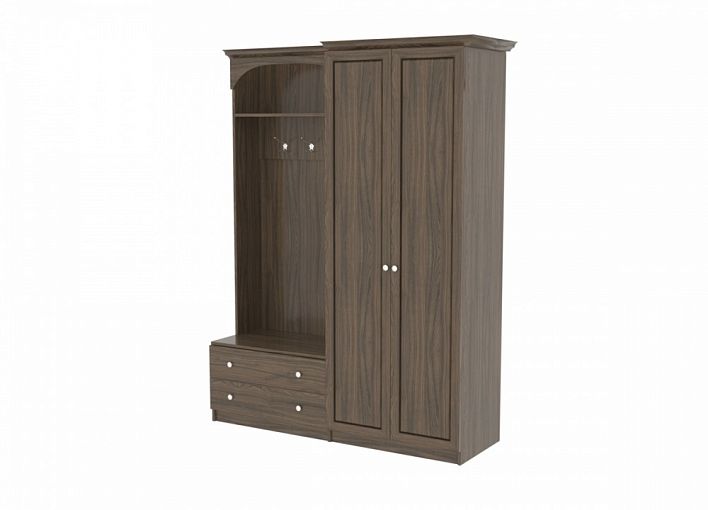 Прихожая Маркус 1-10 BMS гармонично впишется в классические интерьеры и поможет компактно разместить одежду, обувь и аксессуары. Практичная композиция объединила двухдверный платяной шкаф и секцию с открытой вешалкой, полкой для головных уборов и двумя просторными выдвижными ящиками в основании. Традиционные рамочные фасады выполнены в древесных тонах, модель декорирована элегантным карнизом и изящной фурнитурой. Купить прихожую Маркус 1-10 BMS по демократичной цене вы сможете в нашем интернет-магазине.