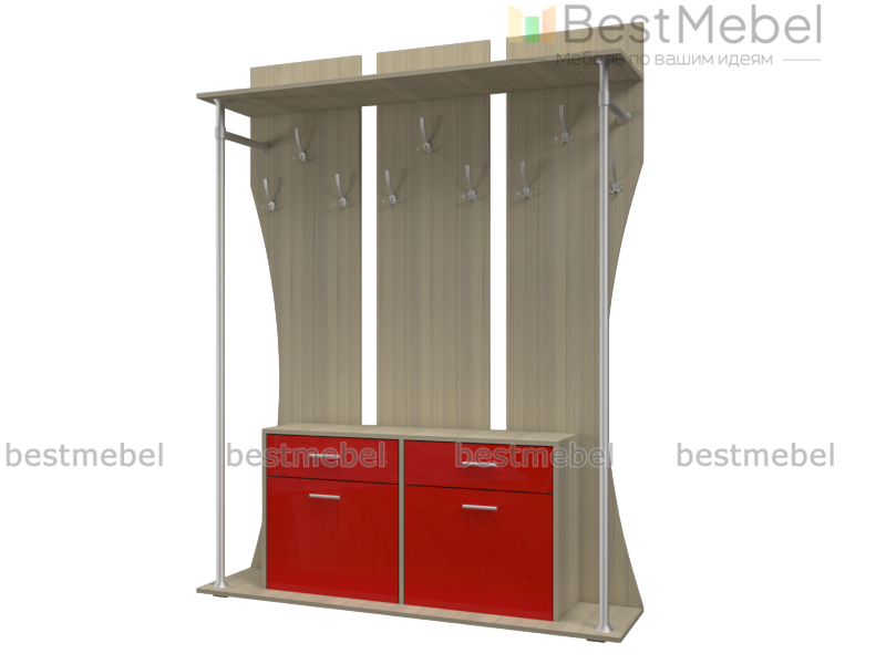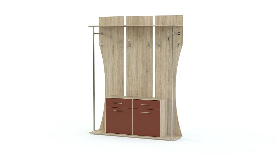 Прихожая МБ 23.1 BMS – оригинальное решение для современных интерьеров. Компактная и визуально легкая, модель гармонично впишется даже в небольшие помещения, а разнообразие расцветок позволит гармонично вписать комплект в меблировку. Прихожая выполнена в сочетании древесных тонов и терракотового и оборудована просторной открытой вешалкой с крючками, двумя мини-штангами на хромированных опорах, антресольной полкой и тумбой-обувницей с откидными лотками и выдвижными ящиками для мелочей. Купить прихожую МБ 23.1 BMS приглашаем недорого в наш интернет-магазин.