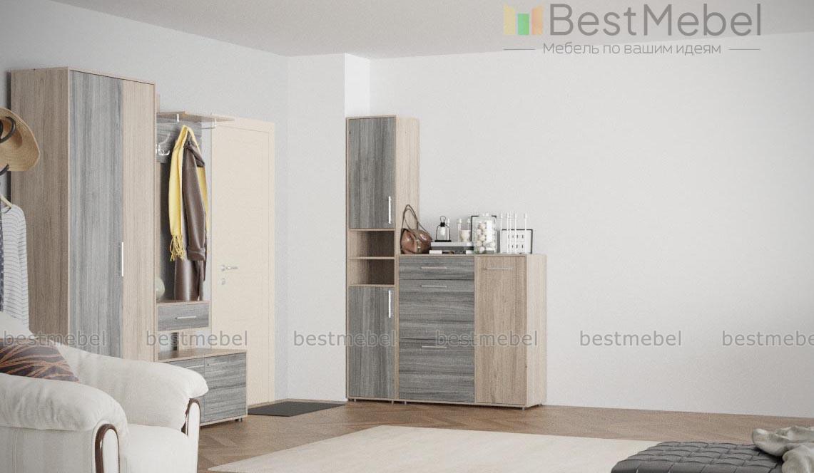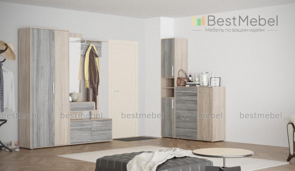 Один из вариантов популярной модульной серии Visit. Вешалка с зеркалом, выдвижным ящиком и тумбой, пенал с дверцами и полками в средней части, оригинальная обувница и двухстворчатый шкаф могут быть скомпонованы в соответствии с индивидуальными особенностями вашего помещения, подчеркивая его плюсы и скрадывая минусы. Цвет модели комбинированный – разные оттенки серого под массив дерева. Прихожая Visit-1 вариант 4 BMS позволит удобно разместить множество вещей и впишется и в классический и в современный интерьер.