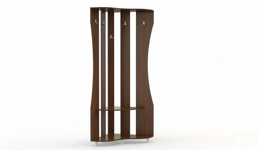 Вешалка угловая Найт 1 BMS визуально облегчает интерьер и помогает выгодно использовать особенности планировки. Напольная модель с декоративными боковыми вырезами выполнена из отдельных вертикальных планок и располагается на высоких ножках. Пять крючков, расположенных на двух уровнях, и радиусная полка в нижней части помогут компактно разместить одежду, обувь, аксессуары и головные уборы. Купить вешалку угловую Найт 1 BMS вы сможете в нашем интернет-магазине с выбором фурнитуры и цвета по каталогу.