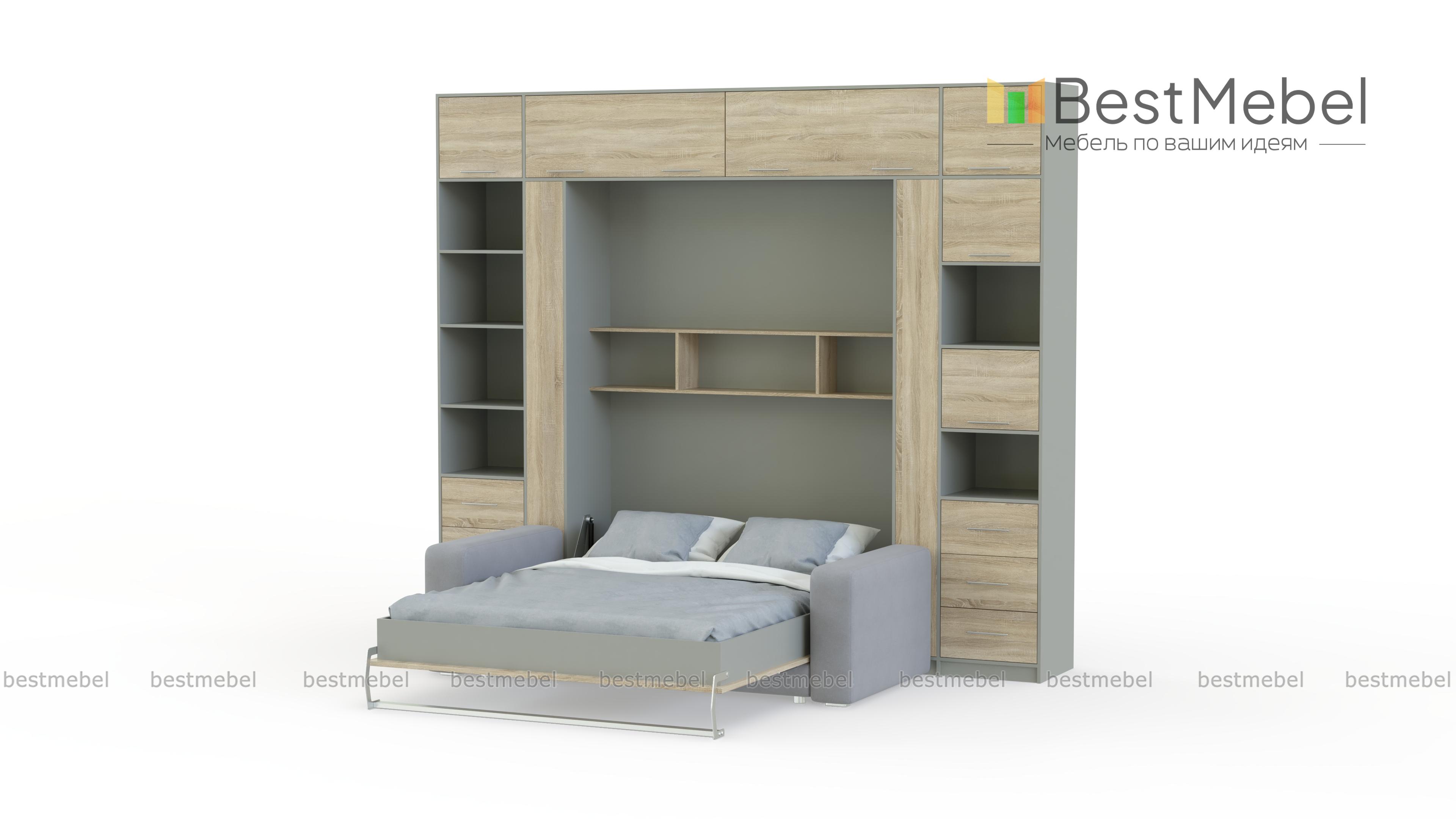 Шкаф-кровать с диваном Изабель-6 BMS привлекает ярким и функциональным современным дизайном. Практичная модель в сочетании древесного и белого гармонично дополнит интерьер небольшой городской квартиры. Высокий шкаф с антресолью удобен для хранения разнообразных бытовых вещей, а с комфортом отдохнуть поможет уютный диванчик без подлокотников. В центре располагается откидная кровать с вертикальным подъемом, которая легко раскладывается при помощи надежного механизма. Купить шкаф-кровать с диваном Изабель-6 BMS приглашаем выгодно в наш интернет-магазин.