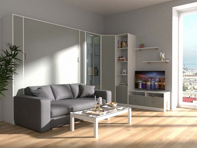 Шкаф-кровать с диваном Шелли 23 BMS эффектно дополнит современные интерьеры в стиле минимализм и сэкономит пространство. Угловой комплекс включает в себя шкафы с витриной и открытыми полками, пенал для одежды и модуль с откидной кроватью и уютным диваном. Комфортная зона отдыха днем легко превращается в спальню при помощи надежного механизма трансформации. Нейтральная серо-белая гамма сделает помещение визуально просторнее. Купить шкаф-кровать с диваном Шелли 23 BMS для небольших квартир и студий приглашаем к нам в интернет-магазин.