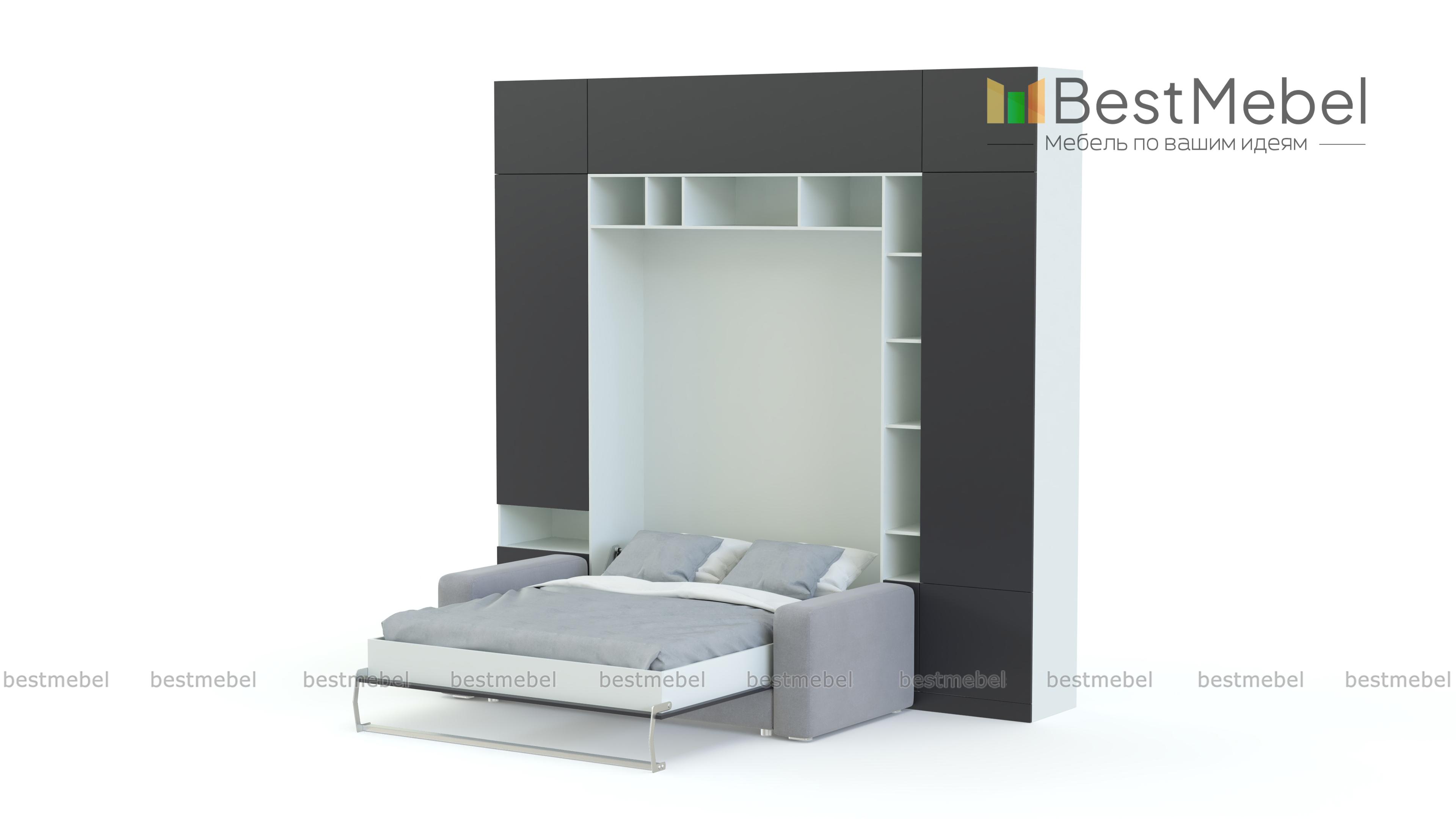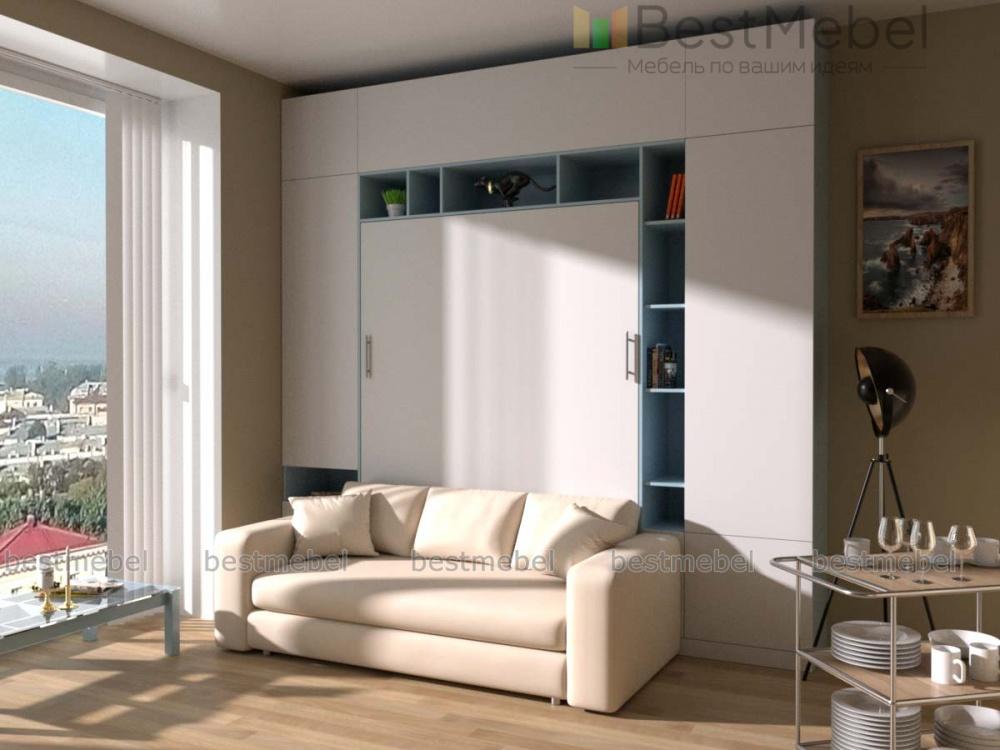 Шкаф-кровать Тида 06 BMS по достоинству оценят владельцы малогабаритных квартир и студий. Создать функциональный, визуально легкий и светлый интерьер в стиле минимализм поможет вам композиция 3 в 1. Стенка с белоснежным глухим фасадом, дополненным цветными вставками открытых полок, оборудована удобной системой хранения и модулем с откидной кроватью, а комфортный отдых подарит уютный мини-диван. Полноценное спальное место вы получаете при помощи надежного вертикального механизма. Купить шкаф-кровать Тида 06 BMS приглашаем в наш интернет-магазин.