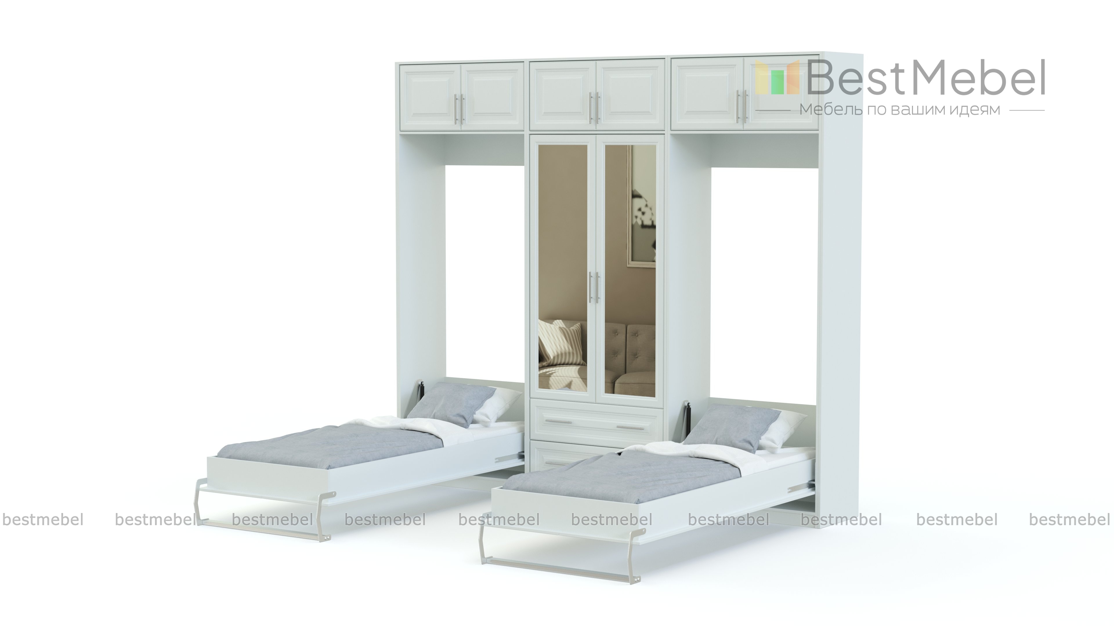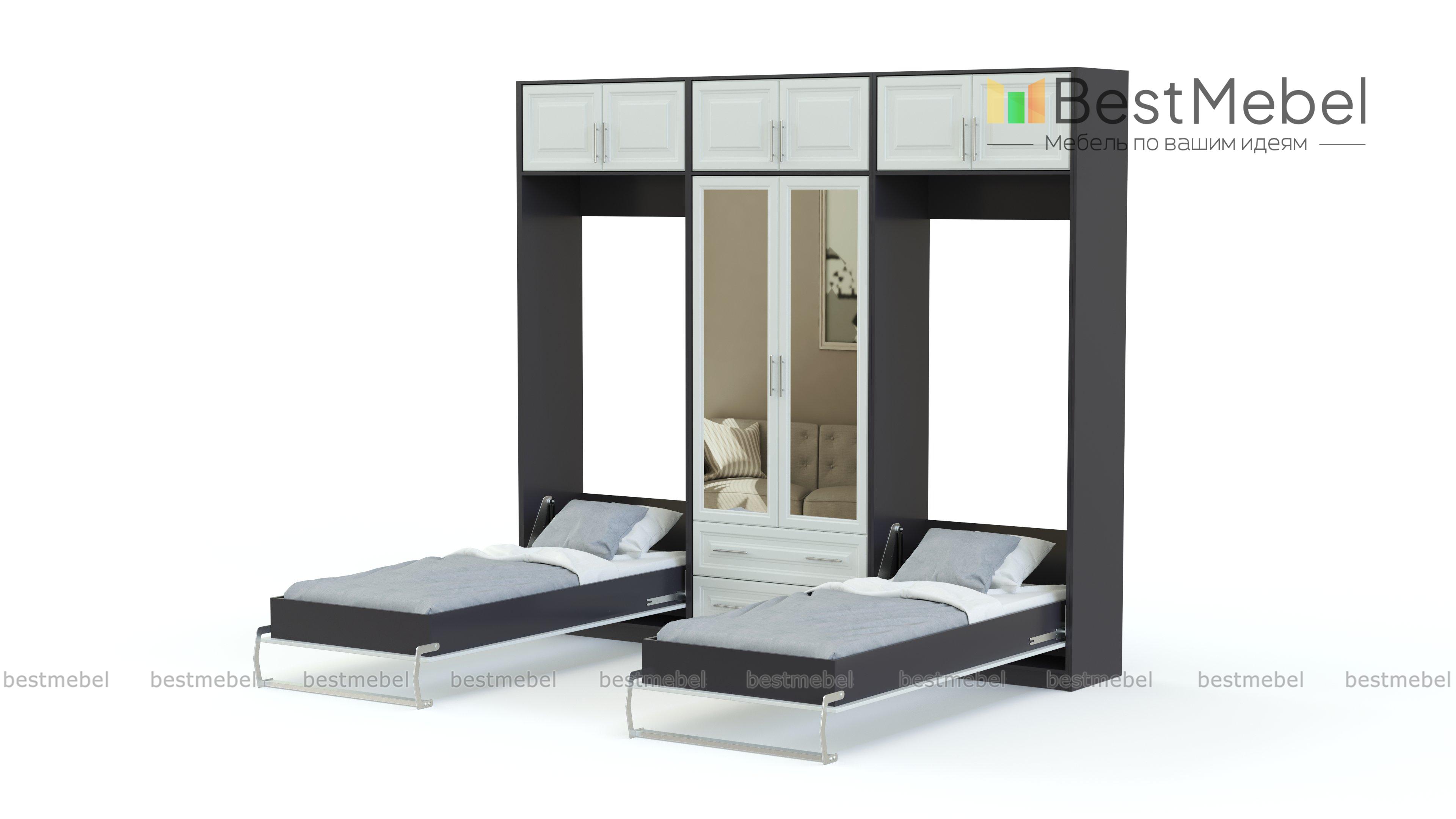 Шкаф-кровать трансформер Элли 11 BMS – элегантное решение, объединившее функции спальни и гостиной. Белоснежный шкаф выполнен в современном классическом стиле и отличается высокой функциональностью. В центре композиции располагается платяное отделение с зеркальными дверцами и выдвижными ящиками, по бокам – модули с откидными кроватями, а практичным дополнением для хранения сезонных вещей станет антресоль. Купить шкаф-кровать трансформер Элли 11 BMS и сэкономить полезную площадь вам всегда поможет наш интернет-магазин.