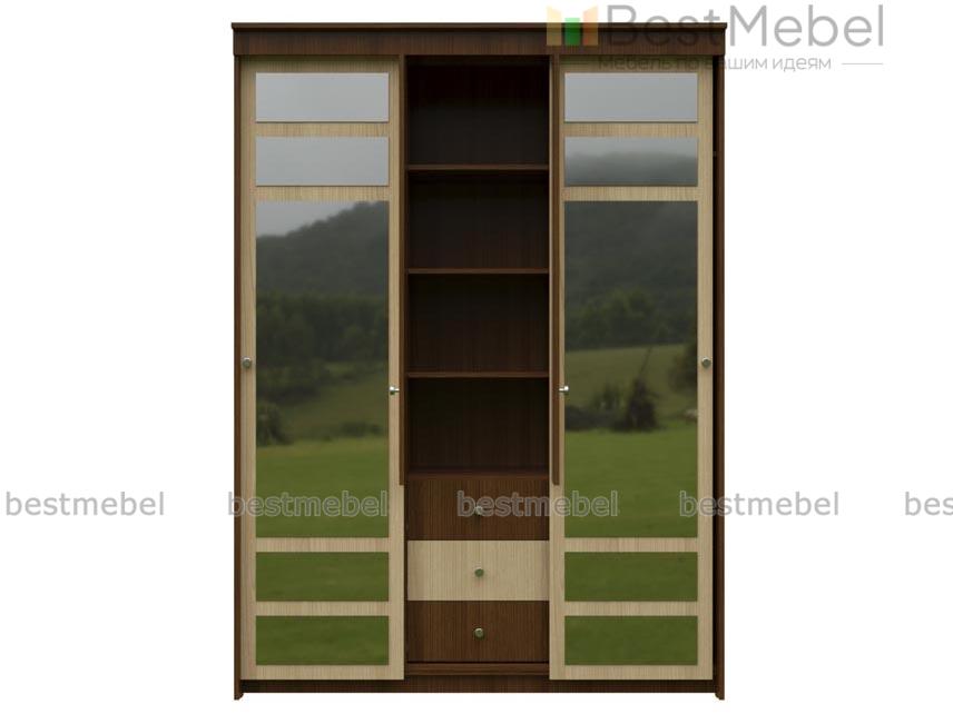Шкаф-купе Юнона BMS представляет собой целый комплект мебели. В его комплектацию вошли два просторных отдела со штангами. По центру располагается распашной отсек и три выдвижных ящика. Благодаря присутствию разнообразных отделов в одном шкафу, Вы можете хранить большой объём различных вещей в одном месте. На фасадах расположены фигурные зеркала, которые преображают пространство вокруг себя. Контрастные древесные оттенки создают в помещении уютную атмосферу. Основные дверки оснащены современной системой направляющих, что создаёт удобный доступ и обзор к содержимому. Модуль может стать дополнением комплектов для прихожей, спальни, гостиной или остаться самостоятельным предметом мебели. Купить по низкой цене шкаф-купе Юнона BMS можно в несколько кликов на нашем портале.