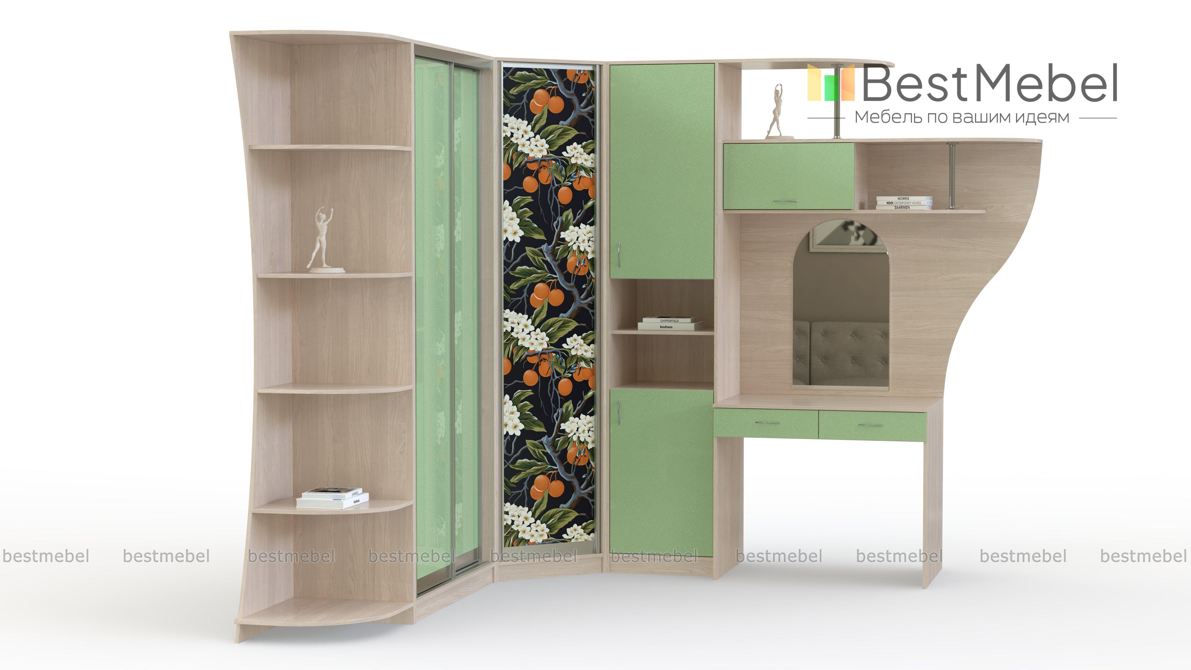 Угловой шкаф-купе Лайм BMS объединил все необходимое для комфортного ухода за собой, хранения гардероба, всевозможных аксессуаров, материалов для работы и хобби. Композиция включает в себя угловой распашной шкаф, двухдверный шкаф-купе, комбинированный с полками пенал, туалетный столик с надстройкой и эффектно вырезанный стеллаж. Для оформления фасадов использованы цветной глянец и контрастная сочная фотопечать. Купить угловой шкаф-купе Лайм BMS вы сможете в нашем интернет-магазине, подобрав цвета и размеры.