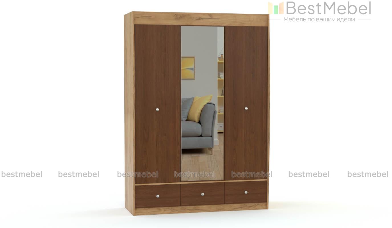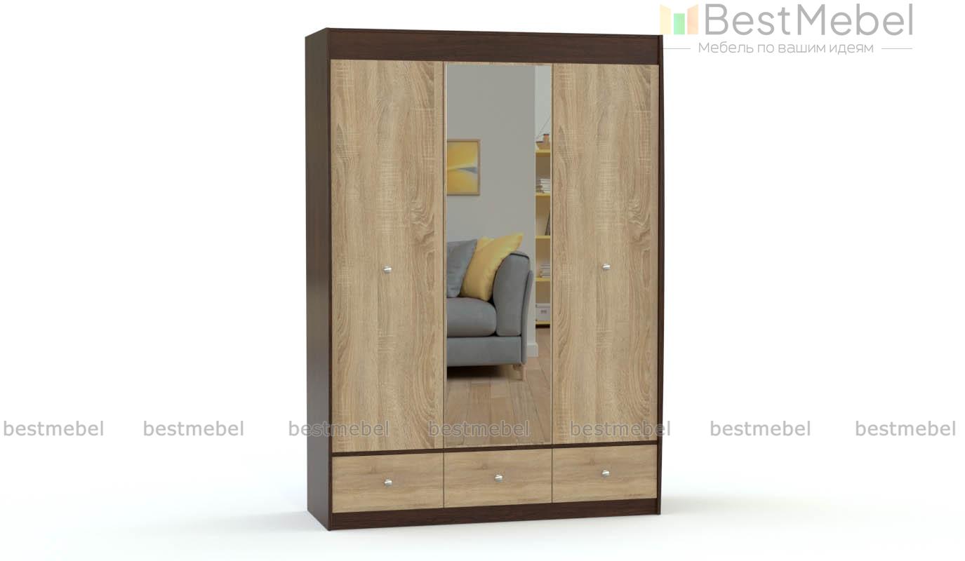 Распашной шкаф Африна BMS подойдет любителям простых и функциональных дизайнов. Недорогая и стильная модель выполнена из ЛДСП в контрастных древесных тонах и оснащена ручками-кнопками. Трехдверное распашное отделение с зеркальной центральной створкой дополнено расположенными в основании тремя выдвижными ящиками для удобного хранения мелочей. Купить распашной шкаф Африна BMS с возможностью выбора цвета приглашаем на сайт нашего интернет-магазина.