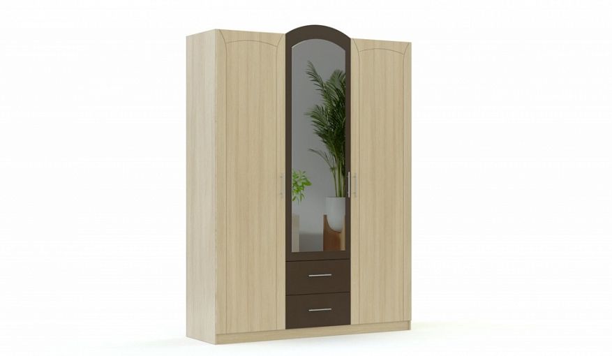 Распашной шкаф Марта 01 BMS с оригинальным декором фасада и арочной центральной створкой сразу привлекает к себе внимание. В оформлении модели скомбинированы светлые древесные тона и коричневый, большое зеркало со скругленным верхом визуально облегчает конструкцию. Трехдверный шкаф имеет удобные средние габариты и отличается хорошей вместительностью благодаря наличию распашных отделений с полками и штангой и двух выдвижных ящиков. Купить распашной шкаф Марта 01 BMS с учетом нужных размеров приглашаем в наш интернет-магазин.