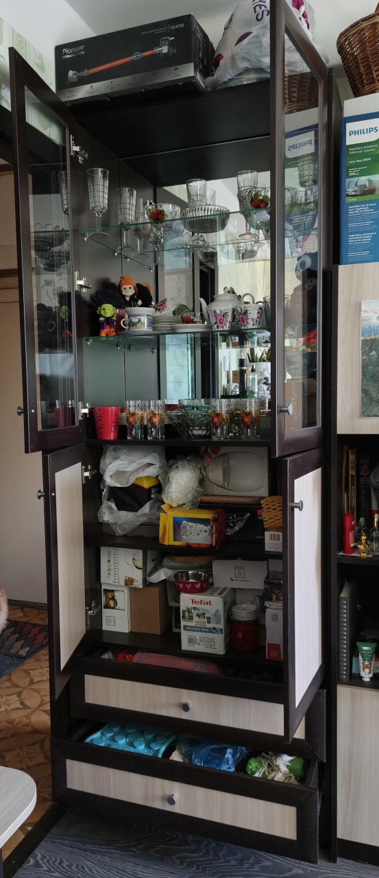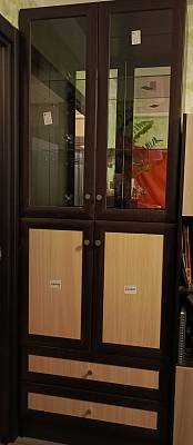 Компактный, но вместительный шкаф. Спокойно умещает три ряда книг, в том числе большого формата.