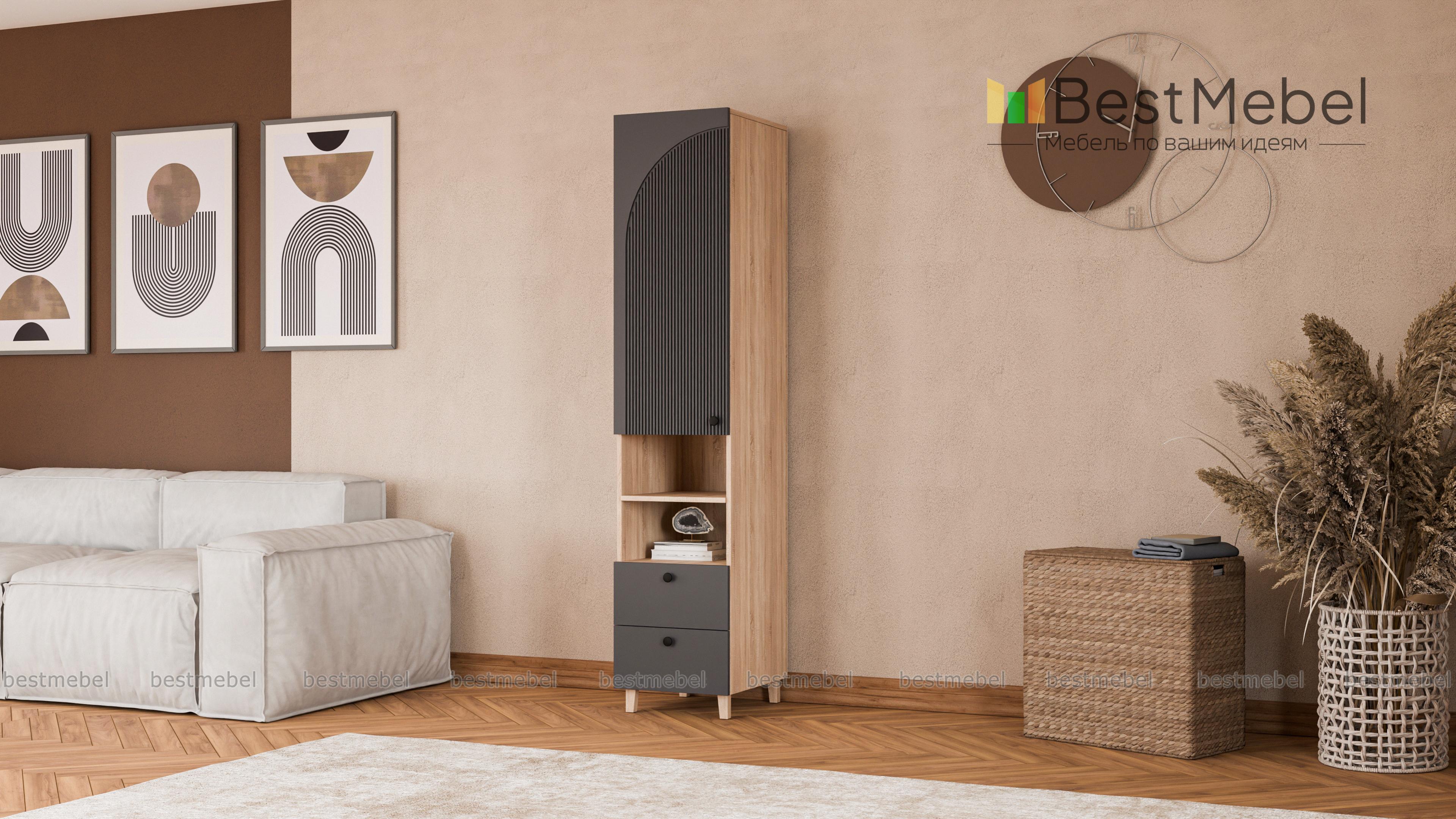 Шкаф-пенал Вивьен 5 BMS — небольшой и функциональный, отлично смотрится и в детской, и в гостиной. Древесного оттенка корпус с высокими ножками, изготовленный из ЛДСП, дополняет стильный фактурный фасад. Для удобного хранения конструкцией предусмотрены вместительное распашное отделение, ниша с полкой и два выдвижных ящика, расположенных снизу. Купить шкаф-пенал Вивьен 5 BMS с выбором размеров, цвета и фурнитуры вы сможете на сайте нашего интернет-магазина.