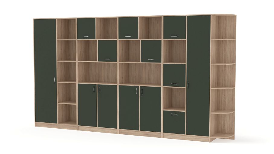 Шкаф Перси 3 BMS отличается крупными габаритами и практичной конструкцией из нескольких функциональных модулей. Продуманная система хранения включает в себя открытые полки, распашные отделения и угловой радиусный элемент. Комбинированный шкаф подходит для меблировки дома и офиса, помогая разместить рабочие материалы, бытовые вещи, одежду и предметы декора. Купить шкаф Перси 3 BMS, выполненный в сочетании светлых древесных тонов и насыщенного зеленого, приглашаем к нам в интернет-магазин.