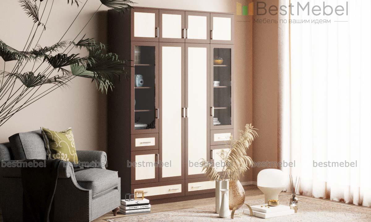Шкаф распашной Фауст 4 BMS привлекает наличием разноплановых отделений, благодаря которым вы сможете компактно разместить одежду, книги, посуду, декоративные предметы и множество бытовых мелочей. Модель оборудована платяным двухдверным отделением, глухими секциями и витринами, выдвижными ящиками и просторной антресолью. Рамочные фасады с ручками-рейлингами выглядят элегантно в контрастных древесных тонах. Купить шкаф распашной Фауст 4 BMS для меблировки гостиной приглашаем в наш интернет-магазин.