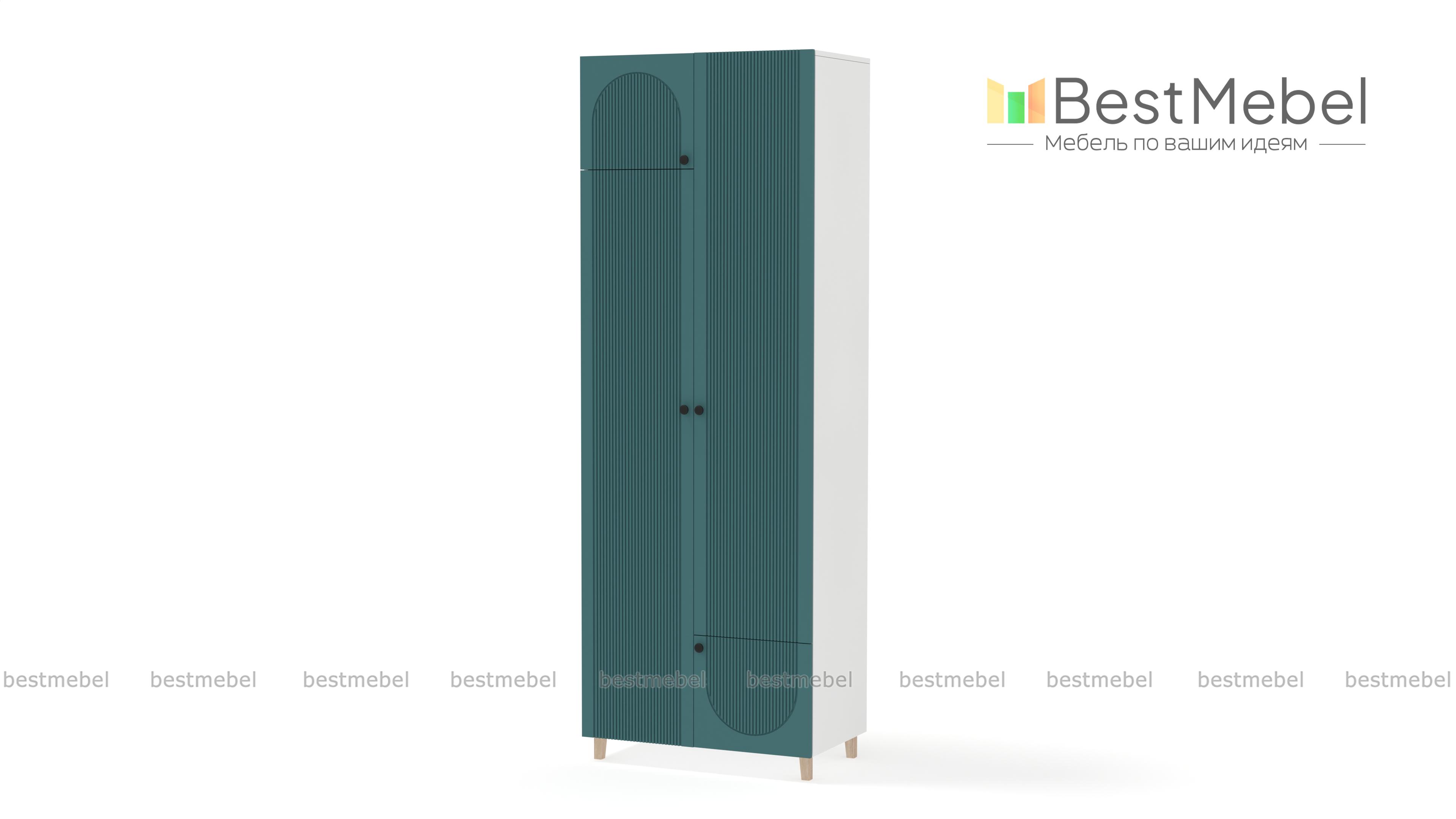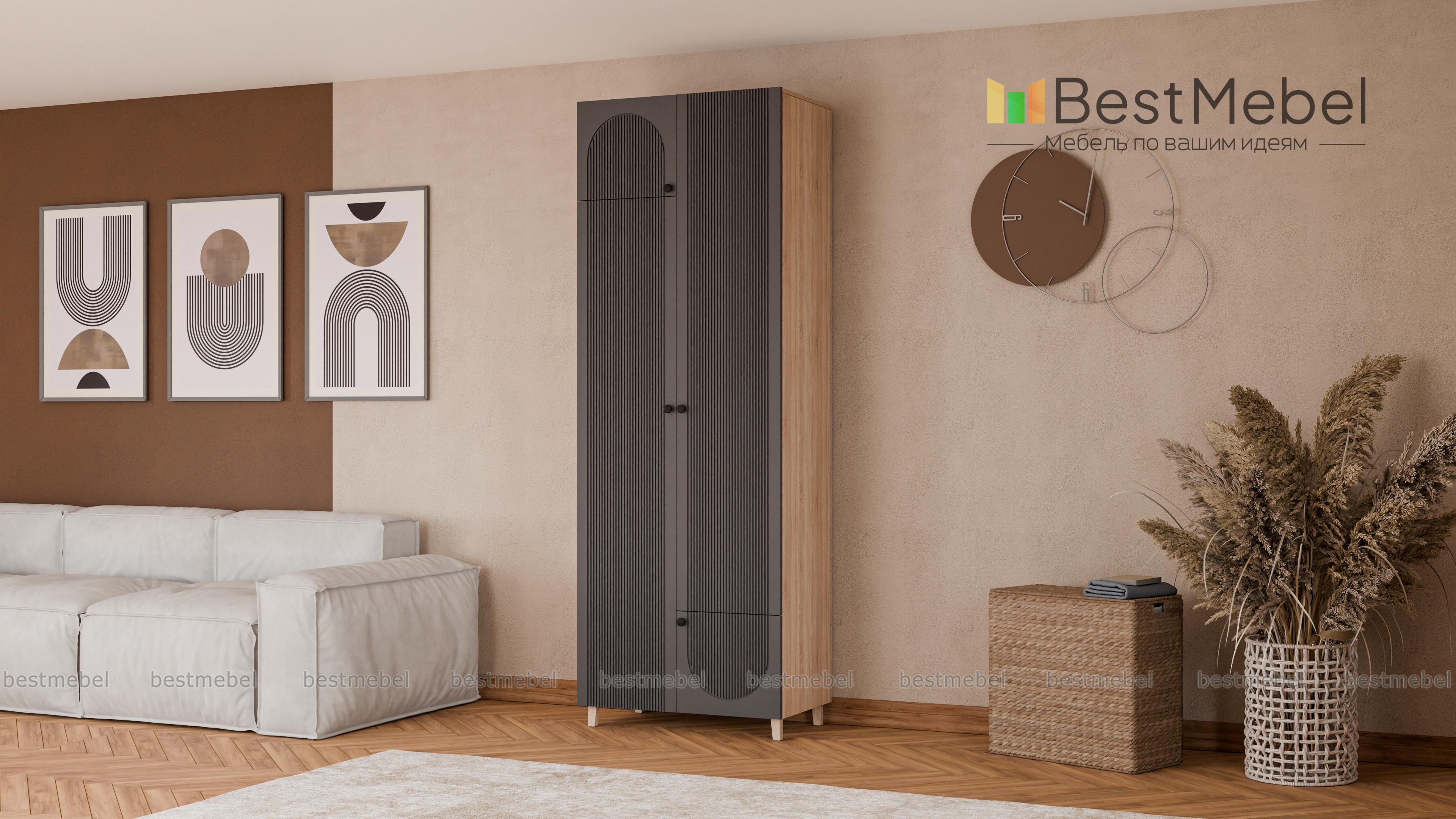 Шкаф распашной Рене 20 BMS компактен и прекрасно впишется в комнаты малого метража: спальни, детские и прихожие. Для более удобного хранения двухдверная модель оборудована дополнительными малыми распашными секциями — сверху и снизу. Прочный фасад из МДФ украшает акцентная фрезеровка, высокие ножки шкафа выполнены в оттенке светлого дерева Купить шкаф распашной Рене 20 BMS, изготовленный по индивидуальным размерам, приглашаем к нам в интернет-магазин.