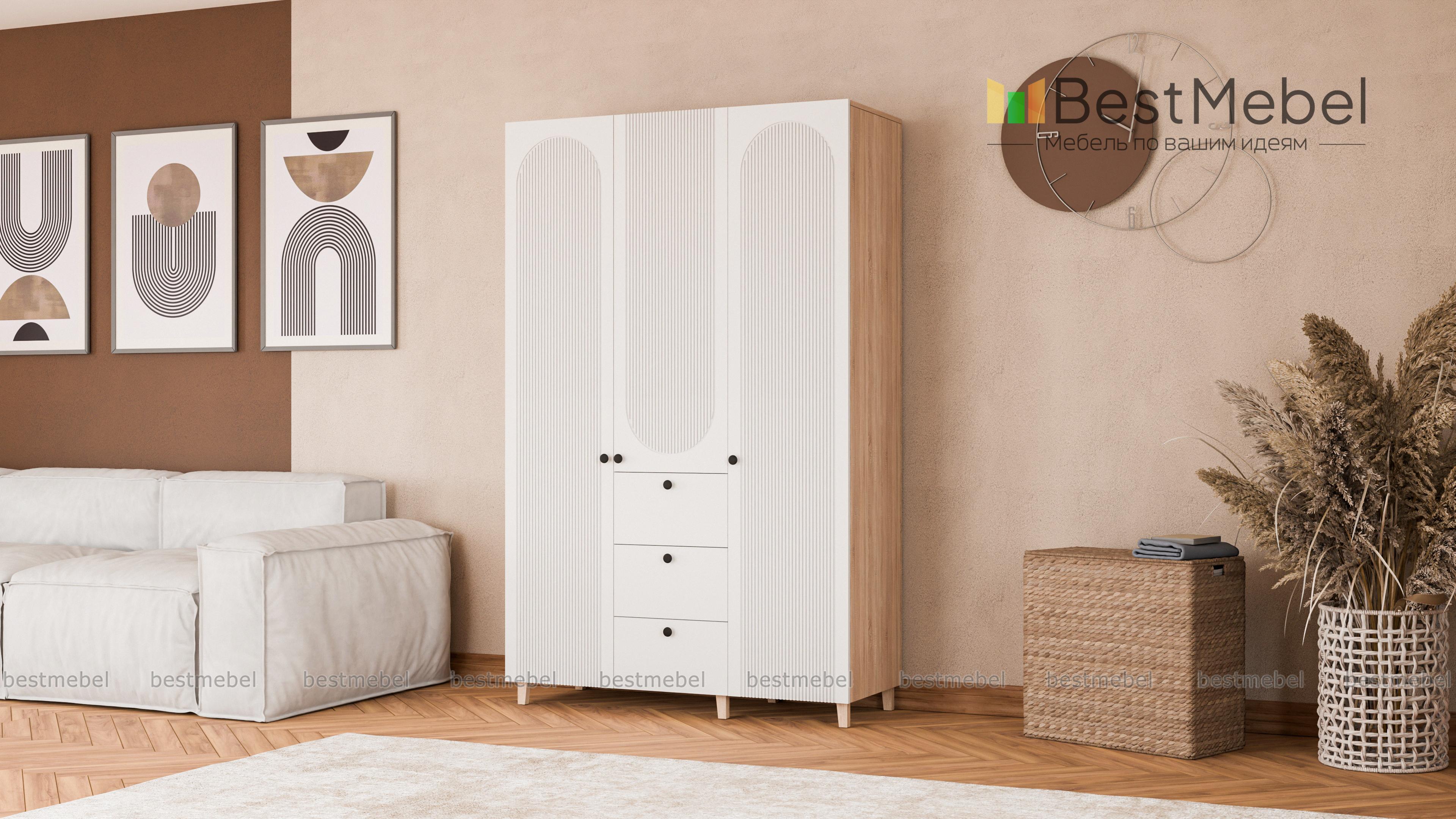 Шкаф распашной Рене 22 BMS с высокими ножками прекрасно подходит для меблировки спален, прихожих и гостиных. Помимо распашных отделений для белья и одежды трехдверный шкаф оборудован рядом из трех выдвижных ящиков, предназначенных для мелочей. На стильном темном фасаде из МДФ — оригинальный рельеф и миниатюрные круглые ручки. Купить шкаф распашной Рене 22 BMS в оттенках из нашего каталога и необходимом размере вы сможете недорого на сайте интернет-магазина.