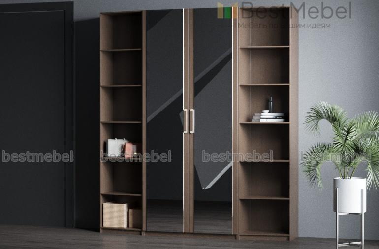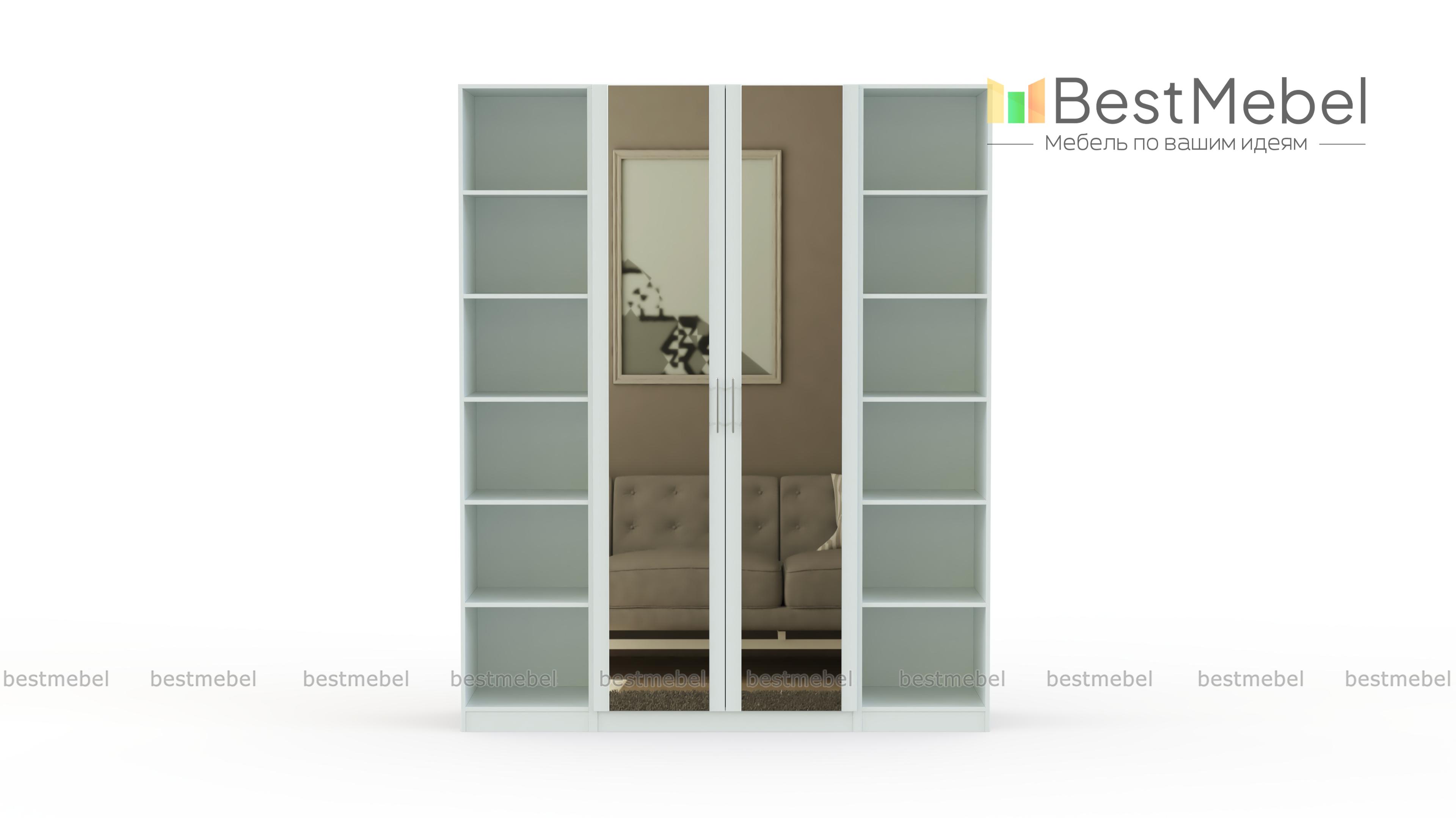 Шкаф распашной с полками Т 4 BMS – универсальная модель в светлых белых тонах, которая будет органично смотреться в интерьере спальни или гостиной. Функциональная конструкция представляет собой сочетание двухдверного шкафа для одежды с зеркальными фасадами и торцевых скошенных стеллажей с просторными полками, которые придают модели визуальную легкость и позволят разместить книги, предметы декора и разнообразные аксессуары. Купить шкаф распашной с полками Т 4 BMS приглашаем по лучшей цене в наш интернет-магазин.