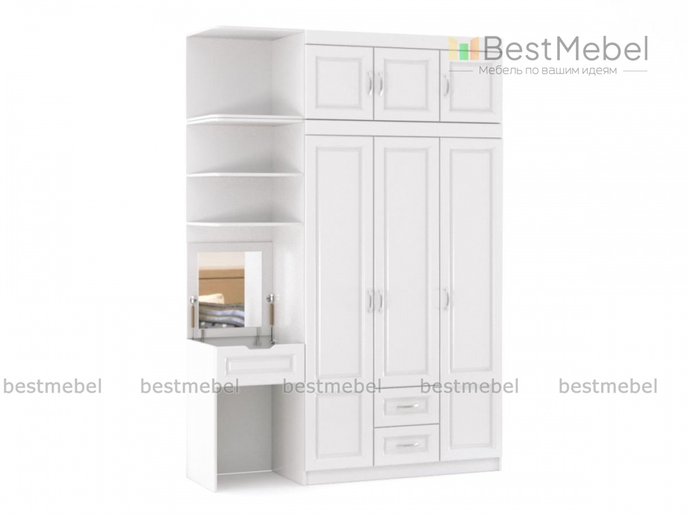 Шкаф со столом Лея 2 BMS поможет вам разместить одежду, сезонные вещи, бытовые мелочи и все необходимое для ухода за собой. Многофункциональная модель объединила трехдверный платяной шкаф с выдвижными ящиками и антресолью, туалетный столик с откидной столешницей, банкетку и просторные открытые полки. Выполненный в белом цвете и декорированный рамочной фрезеровкой, шкаф делает комнату визуально светлее и просторнее. Купить шкаф со столом Лея 2 BMS приглашаем в наш интернет-магазин.