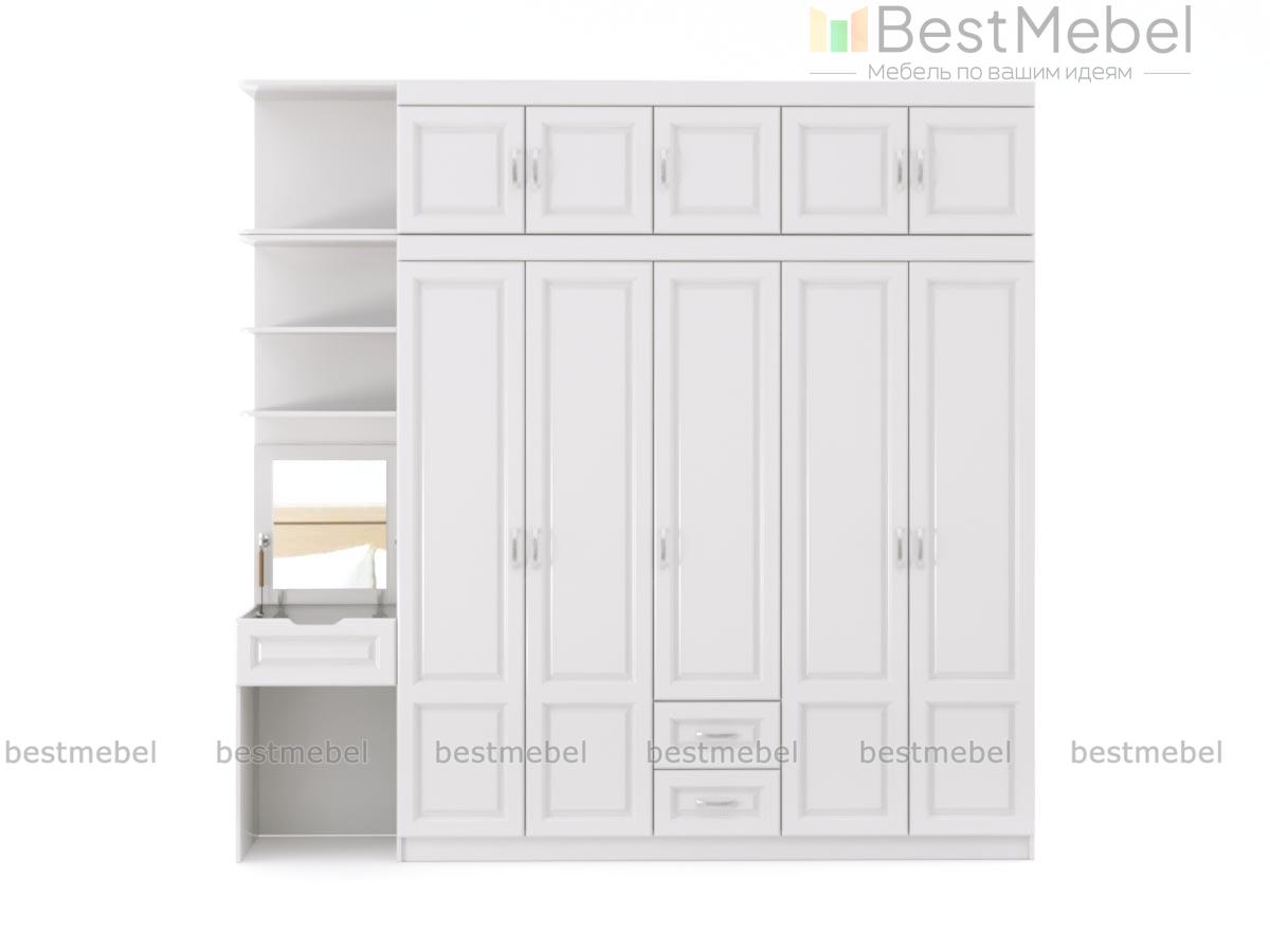 Шкаф со столом Лея 4 BMS – это многофункциональная модель, объединившая удобную систему хранения и туалетный столик. Пятидверный шкаф с платяными и бельевыми отделениями, выдвижными ящиками и антресолью дополнен открытыми торцевыми полками, туалетным столом с откидной столешницей и банкеткой. Классическая модель выполнена в универсальном белом цвете и декорирована по фасаду рамочной фрезеровкой. Купить шкаф со столом Лея 4 BMS и эффективно использовать пространство вам поможет наш интернет-магазин.