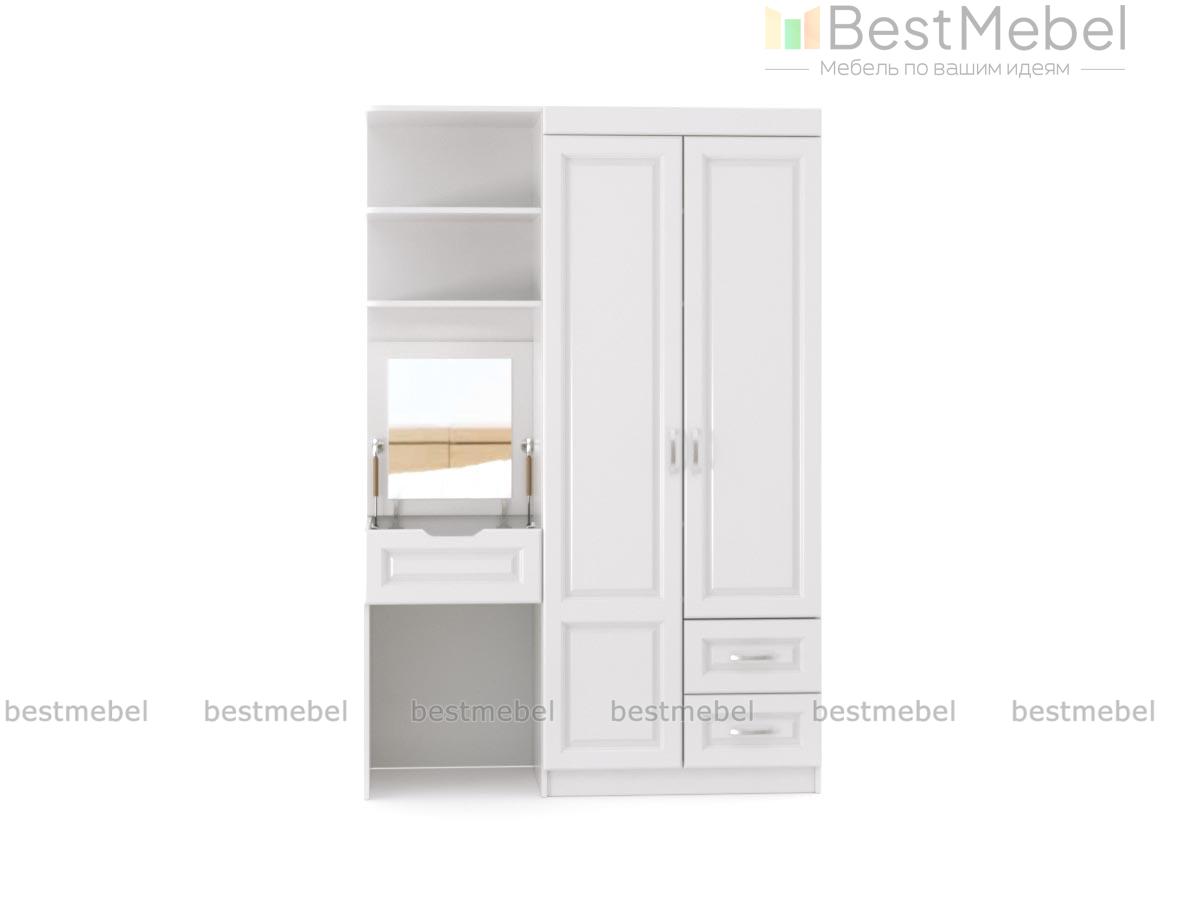 Шкаф со столом Лея 6 BMS поможет значительно сэкономить пространство и сделает небольшую комнату визуально просторнее и светлее. Двухдверный платяной шкаф с выдвижными ящиками в основании дополнен торцевыми открытыми полками для книг, предметов декора и бытовых мелочей, туалетным столиком с откидной столешницей и отсеком для уходовых средств и банкеткой. Белоснежные фасады декорированы рамочной фрезеровкой. Купить шкаф со столом Лея 6 BMS приглашаем выгодно в наш интернет-магазин.