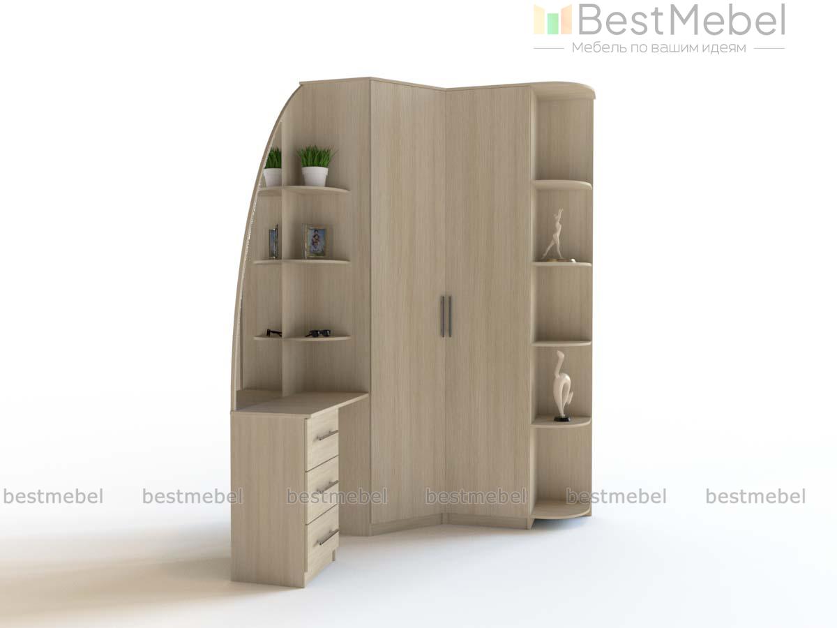 Шкаф угловой Вита BMS – это многофункциональная модель для современного интерьера. Отличная вместительность в сочетании с компактными размерами делают шкаф подходящим вариантом даже для небольших помещений. Группа из углового и прямого распашных шкафов дополнена торцевым стеллажом и столиком с тумбой, эффектно скругленным зеркалом и полочками для мелочей и уходовых средств. Купить шкаф угловой Вита BMS приглашаем в наш интернет-магазин, подобрав цветовое решение.