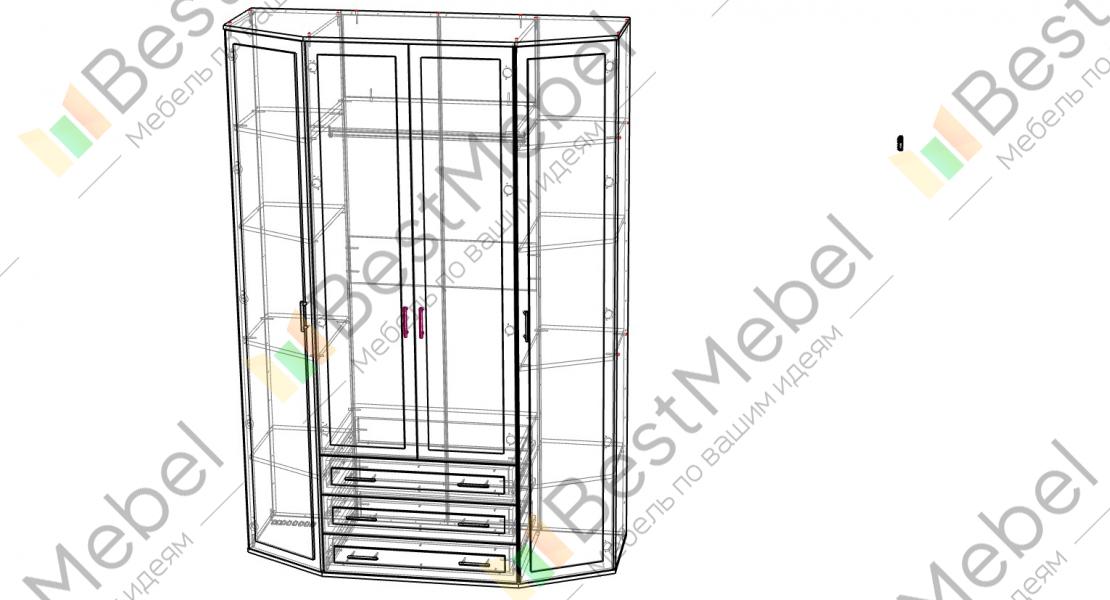Угловой шкаф Эркер-2М BMS выполнен в контрастных древесных тонах с традиционными рамочными фасадами. Универсальная модель будет уместна в интерьере любого типа, сделав домашнюю атмосферу уютнее и позволив компактно разместить одежду, постельное белье и аксессуары. Угловая конструкция шкафа сэкономит место и станет оптимальным выбором для небольших спален, гостиных и прихожих. В центре располагается платяное отделение, по бокам – бельевые с полками, нижняя часть оборудована тремя просторными выдвижными ящиками. Купить угловой шкаф Эркер-2М BMS вы сможете недорого в нашем интернет-магазине.