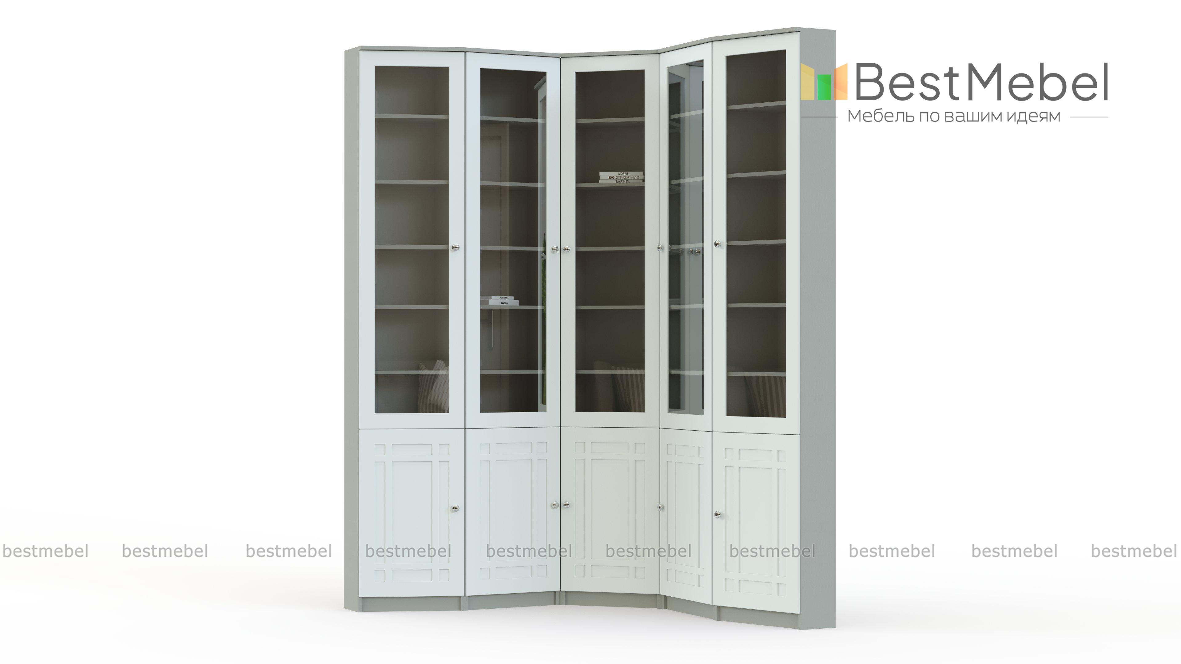 Шкаф угловой Локи 4 BMS гармонично впишется в классический интерьер гостиной или рабочего кабинета и бережно разместит домашнюю библиотеку. Шкафная группа включает в себя модуль в форме трапеции, два прямых и два скошенных элемента. В нижней части располагаются глухие отделения, а в верхней – застекленные просторные полки. Выполненная в матовых оттенках, композиция декорирована по фасаду фрезеровкой. Купить шкаф угловой Локи 4 BMS приглашаем в наш интернет-магазин по лучшей цене.
