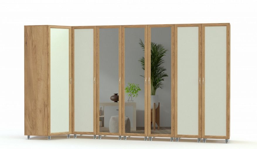 Угловой шкаф Мелина 7 BMS отличается крупными габаритами, практичной Г-образной формой и поможет рационально организовать пространство большой комнаты. Яркая современная модель с рамочными фасадами сочетает в оформлении золотой крафт и белый с зеркалами, а визуальную легкость конструкции придают высокие металлические ножки. Шкафная группа включает в себя угловой модуль и пеналы, оборудованные бельевыми полками и штангами для удобного хранения предметов гардероба и домашнего текстиля. Купить угловой шкаф Мелина 7 BMS приглашаем на сайт нашего интернет-магазина.