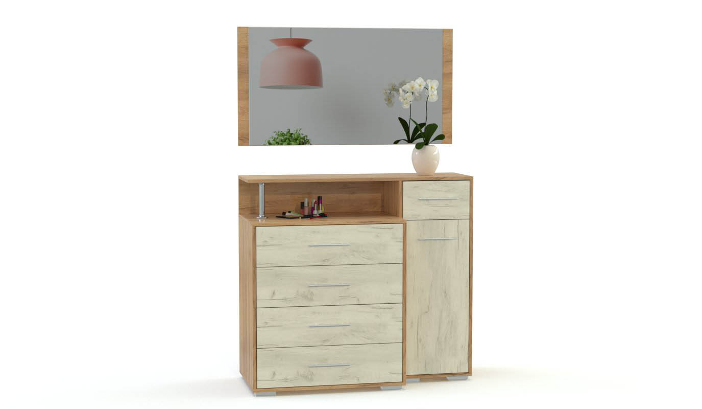 Выбрать оптимальное сочетание элементов и цветовое решение для вашей комнаты поможет модульный комплект для спальни Берта 2 BMS. Гарнитур состоит из четырехдверного шкафа с зеркалами в полный рост, дополненного угловой секцией - стеллажом, двуспальной кровати с оригинально декорированной спинкой, двух тумб и практичного комода с функцией туалетного столика. Стильный и современный вид придают ему лаконичная отделка и сочетание двух естественных древесных оттенков.