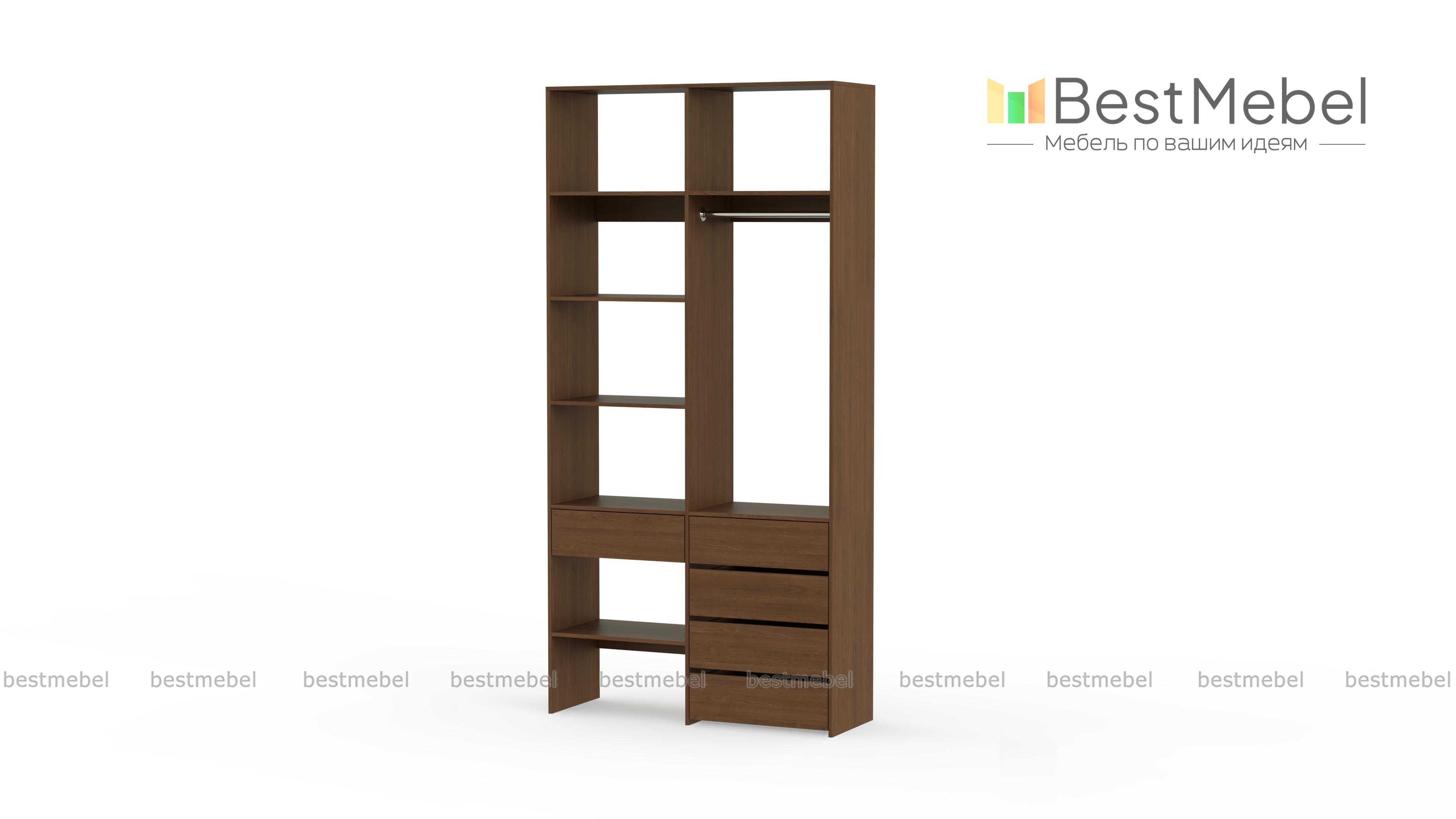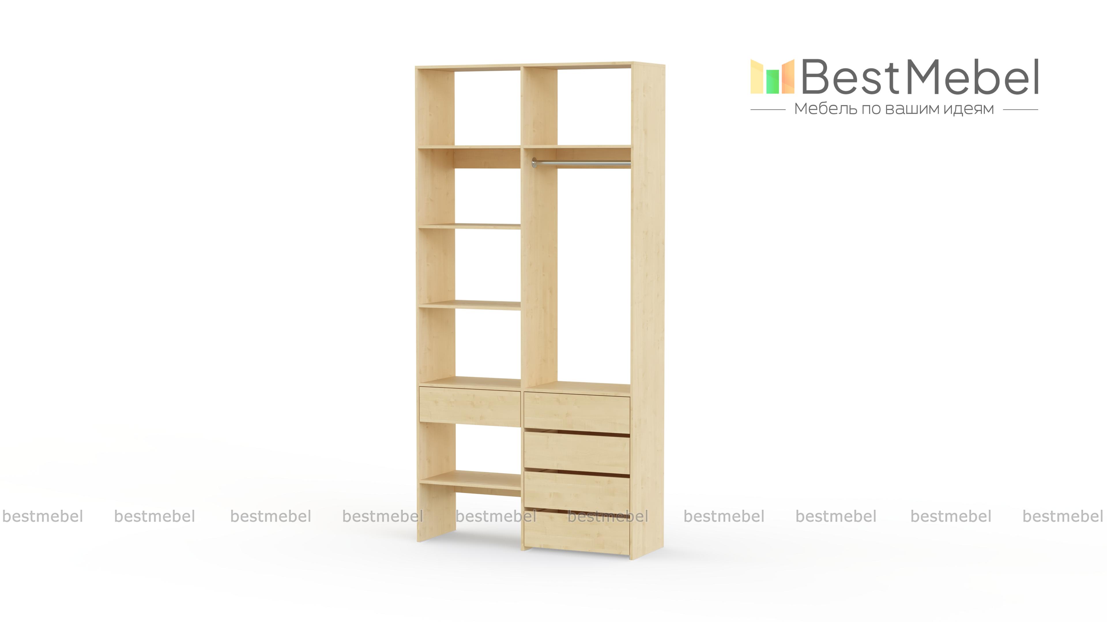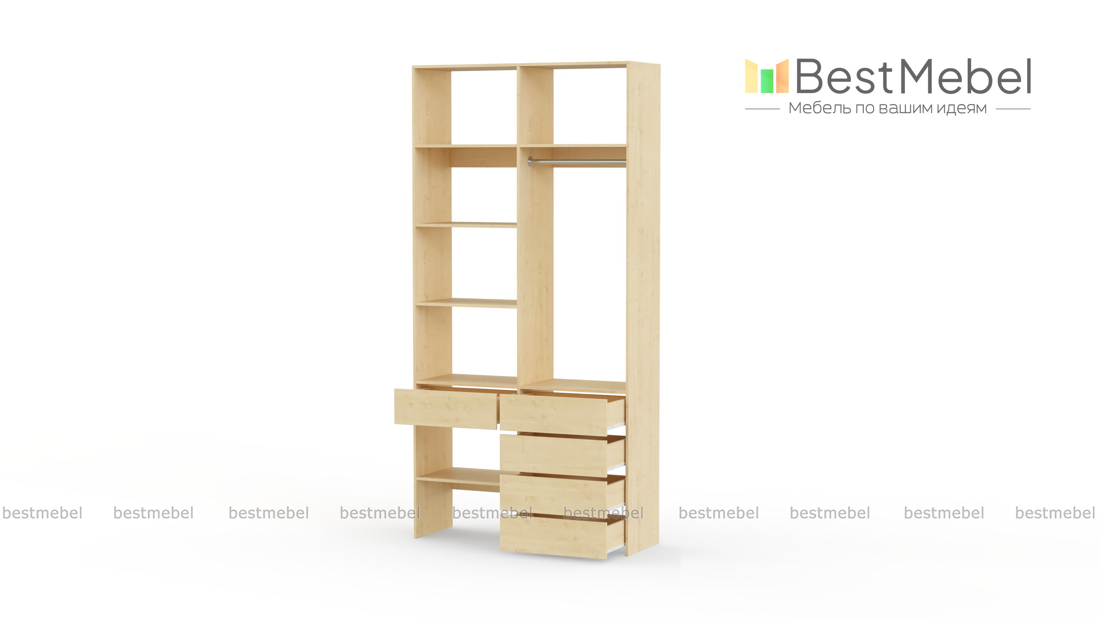 Стеллаж для одежды Мирта 1 BMS подходит для обустройства гардеробной, спальни или торгового зала. Изготовленная из высококачественной ламинированной плиты, конструкция обладает прочностью и долговечностью. Открытые полки дополнены штангой и пятью выдвижными ящиками, позволяя разместить одежду на вешалках и в сложенном виде, обувь и аксессуары. Купить стеллаж для одежды Мирта 1 BMS в необходимом размере и цвете вы сможете на сайте нашего интернет-магазина.