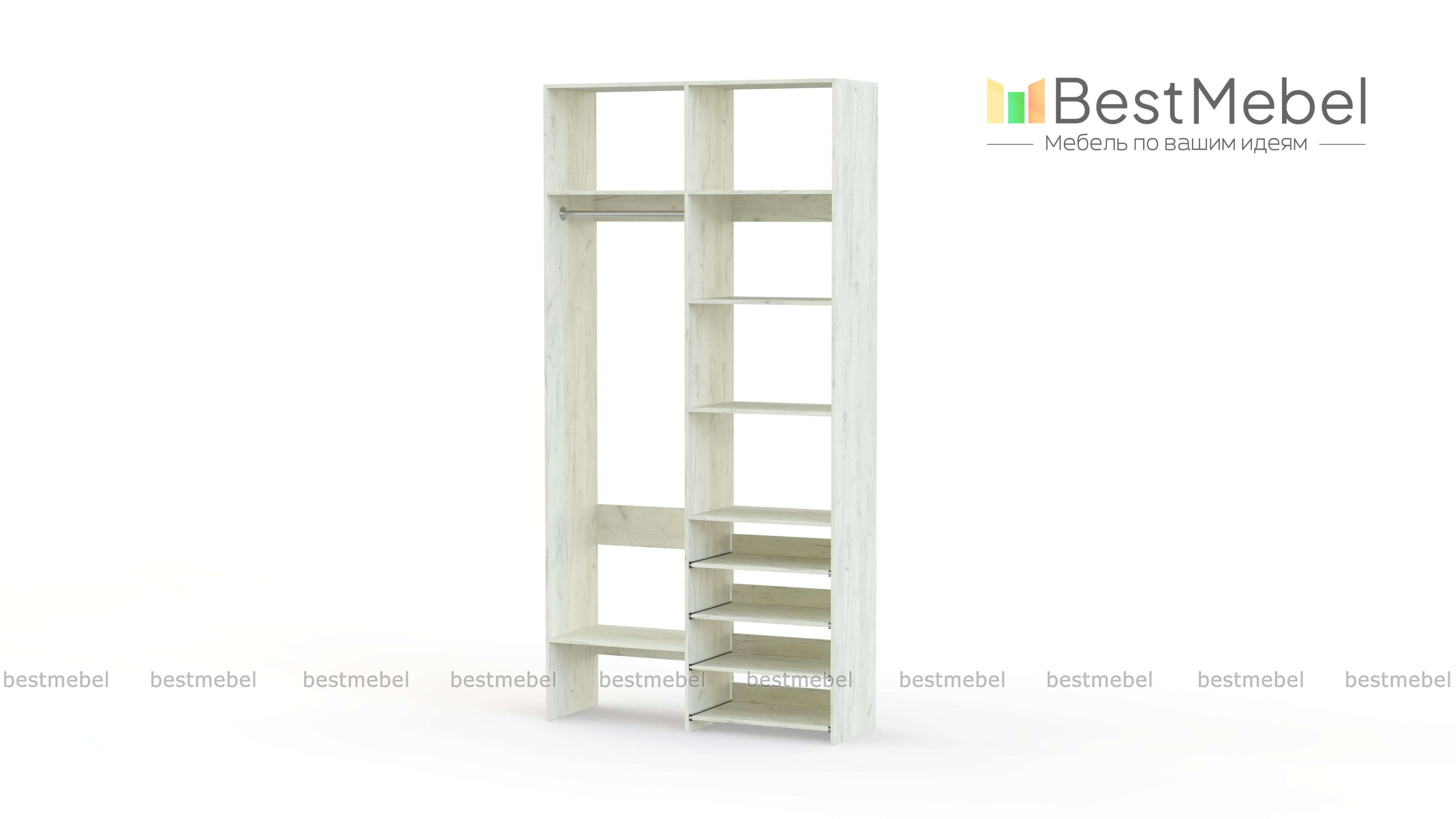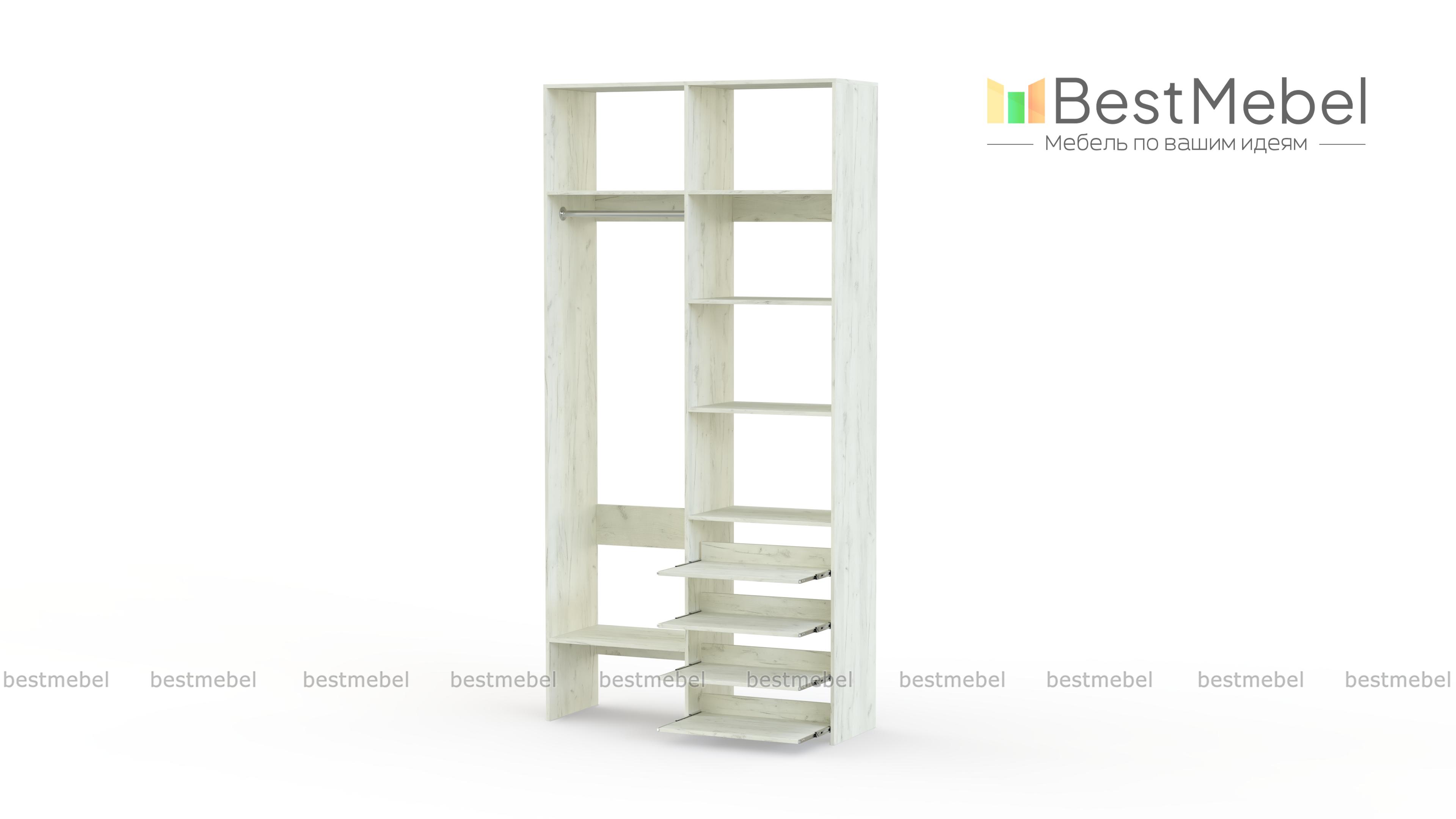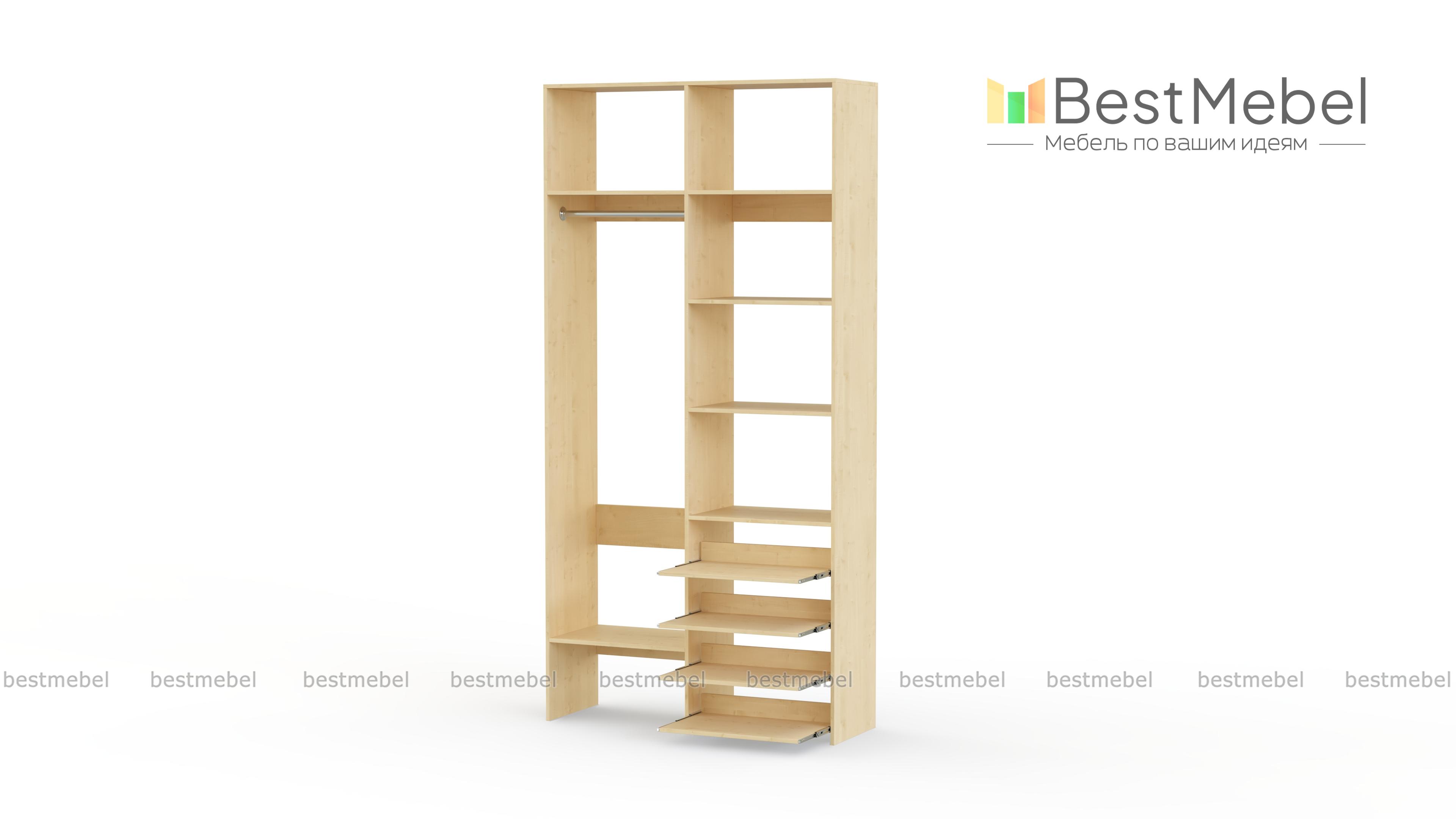 Стеллаж для одежды Мирта 79 BMS подойдет вам, если вещей немного. Компактная по ширине конструкция оборудована не только штангой для вешалок и стандартным набором бельевых полок, но и четырьмя выдвижными панелями. В нейтральном природном оттенке стеллаж выглядит современно, а простая форма хорошо вписывается в пространство. Купить стеллаж для одежды Мирта 79 BMS, изготовленный по индивидуальным размерам, вы всегда сможете на сайте нашего интернет-магазина.
