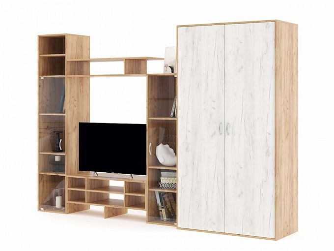 Гостиная Рубис BMS отличается современным дизайном, вместительностью и демократичной ценой. Модель станет разумной альтернативой громоздкой мебели в малогабаритных помещениях и позволит разместить одежду, книги, предметы декора и аппаратуру. Лаконичный дизайн элементов не будет перегружать интерьер лишними деталями. В комплект входят распашной двухдверный шкаф, два пенала-витрины, тумба под ТВ с открытыми секциями и оригинальная надстройка. Купить гостиную Рубис BMS недорого приглашаем в наш интернет-магазин.