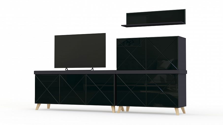 Стенка для гостиной Румба 3 BMS оптимальна для небольших современных квартир и студий. Модульная мини-композиция компактна по размеру и позволяет гармонично вписать элементы в интерьер. В комплекте широкая тумба под ТВ, высокая тумба с распашными дверцами и навесная открытая полка для книг и декоративных мелочей. Эффектные фасады в черном глянце украшены фрезеровкой. Купить стенку для гостиной Румба 3 BMS приглашаем в наш интернет-магазин по доступной цене.